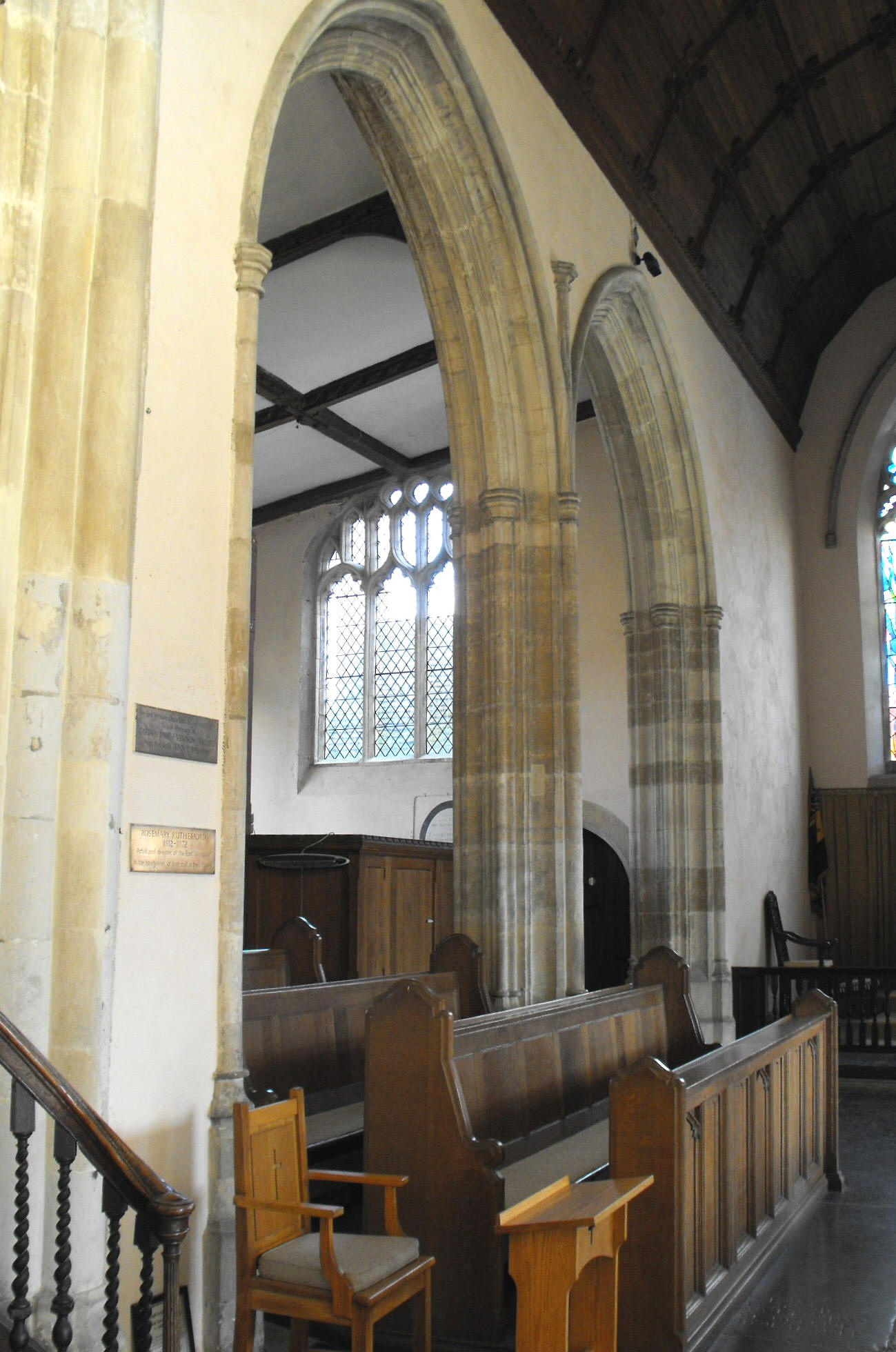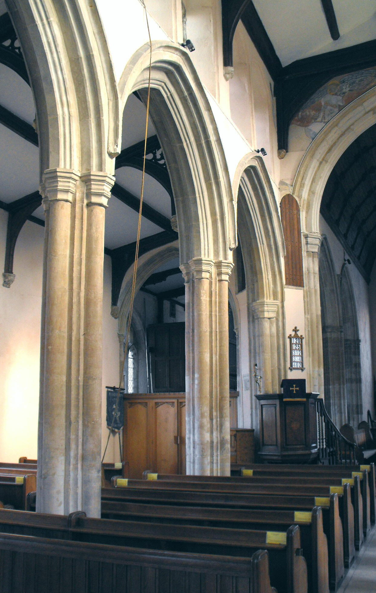 These are constructed in four bays, formed of arches of two orders decorated by a hollow on the outer order and a double wave moulding on the inner order, springing from piers formed of semicircular shafts separated by hollows. Whatever their date may be, it seems clear the tower arch is older and very possibly of the first half of the fourteenth century rather than the second (and thus from Decorated times), for here the arch carries a flat and a hollow chamfer, of which the former springing from semi-quatrefoil responds and the latter continues down the jambs without intervening capitals. The chancel arch is similar in except that here, the inner order carries a roll moulding. The arch from the S. aisle to the S. chapel - which is probably dated by money Birkin Haward found had been left towards the chapel in 1468-69 (Suffolk Medieval Church Arcades, Hitcham, The Suffolk Institute of Archaeology and History, 1993, p. 175) - consists of a double-flat-chamfered arch supported on semi-quatrefoil responds, yet the two-bay arcade between this chapel and the chancel, is similar in style to the nave arcades.