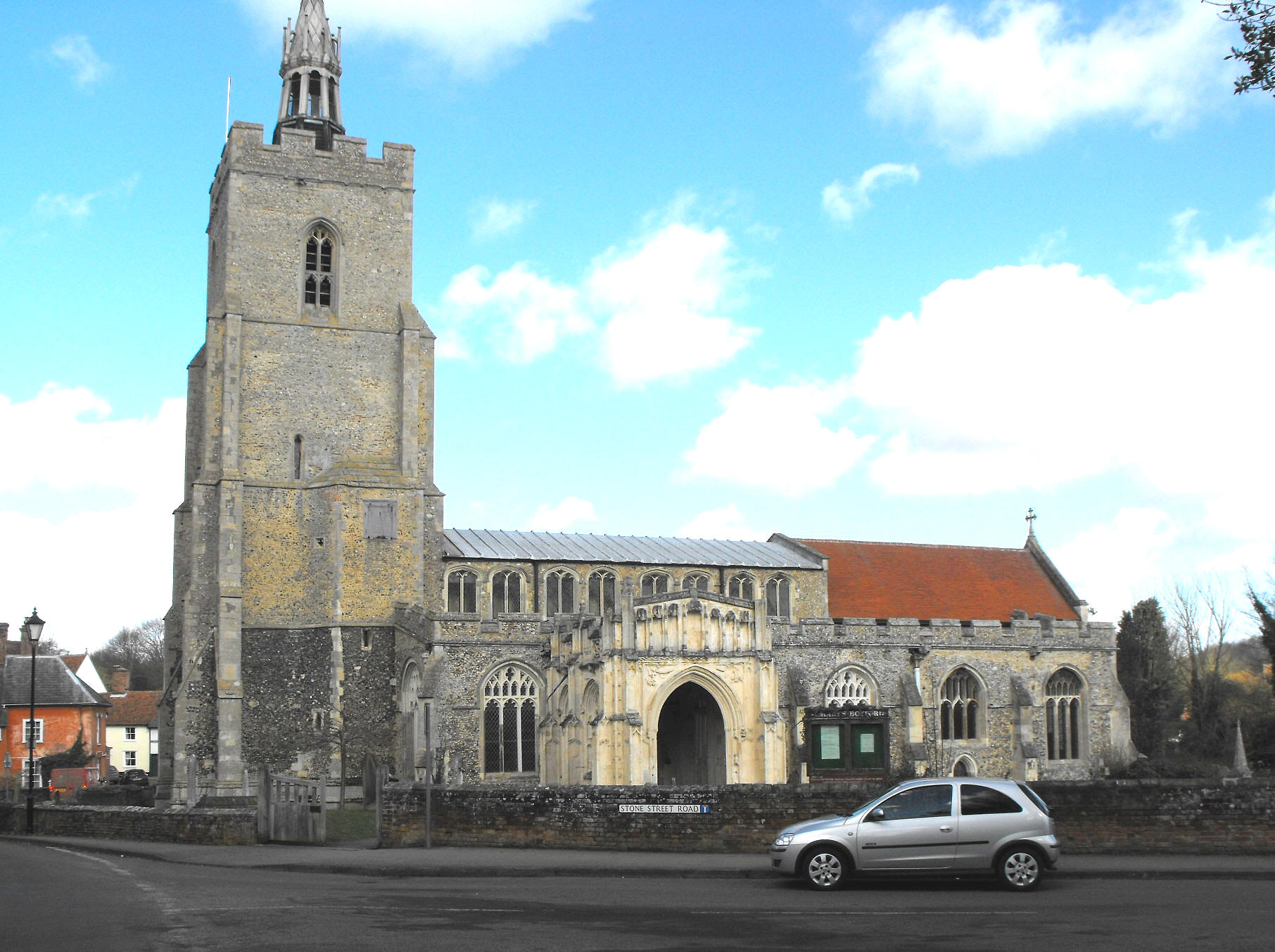 This is a large church, standing in the centre of the village. With the obvious exception of its wooden N. porch, it is predominantly Perpendicular in style and consists of a W. tower now with a surmounting timber lantern, a four-bay aisled nave with a large, stone-built S. porch, and a three-bay chancel with a two-bay chapel on either side. It is constructed of flint and pebble rubble with the additional use of a considerable amount of a white, calcareous stone that appears at first to be clunch, but which is actually Caen sandstone, demonstrating just how hard it can sometimes be to identify building stones by visual examination alone.