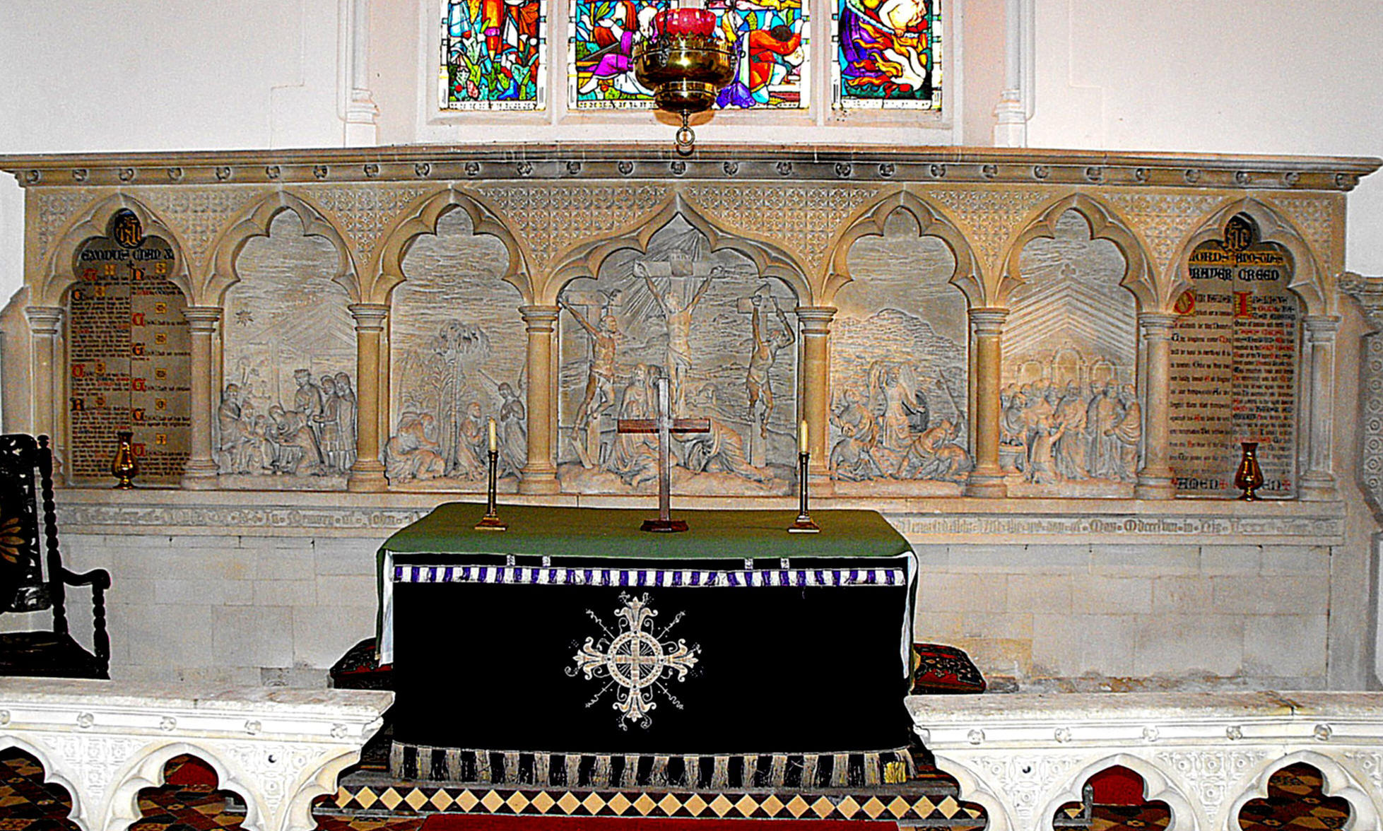Except for a discussion of the monuments in the N. chapel and a mention of the Norman origins of the round lower stage of the tower (and it is more likely to be Norman than Saxon as the notes in the church claim, for walls 6' thick were very unusual before the Conquest), Pevsner dismissed this building in the original Suffolk volume of The Buildings of England with the words, 'The rest mostly of 1863'. In fact, the church today displays a complex medley of dates and styles by a variety of mostly second-class Victorian architects, identified by James Bettley (in the revised 'Suffolk East' volume of The Buildings of England, New Haven & London, Yale University Press, 2015, p.142) as J.K. Colling (who added the octagonal tower bell-stage in 1886), Sir E.C. Kerrison and the Rev. G.M. Paterson (who 'restored and partly rebuilt' the church over an extended period from 1857-86), E.B. Lamb (who re-roofed the chancel in 1860), and Thomas Jekyl (who restored the porch, re-roofed the nave, rebuilt part of the N. aisle, and added the N. transept between 1859-63), each of whom appears to have adopted his own favourite (and different) style, regardless of whatever had been done before, even to the extent of introducing a heavy neo-Norman style for the two-bay arcades between the chancel and N. chapel and between the aisle and western section of the nave. From the whole of this period however, the only features really worthy of examination are the work of the Suffolk sculptor, James Williams (1798-1888), who designed, in particular, the excellent reredos, which was exhibited in London in 1881. Formed of seven cinquefoil-cusped arches, the five central bays contain carved scenes in bas-relief, portray, from left to right, in crisp and passionate detail to which the photograph below does scant justice, the Nativity, the Agony in the Garden, the Crucifixion, the Resurrection, and the Doubting of St. Thomas. However the same artist's large, ponderous stone pulpit is, unfortuantely, rather less successful, notwithstanding the carefully cut figures of saints beneath the trefoiled arches supported on circular shafts around the sides.