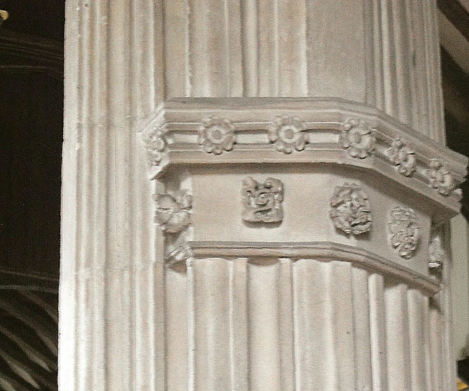 Inside the church, interest moves to the N. arcade. In complete contrast to the N. aisle windows, this is an excellent piece of work, formed of four arches bearing a complex series of narrow mouldings, rising from rhomboidal piers with mouldings continuing down the north and south sides but interrupted towards the openings by capitals finely decorated with fleurons. (See the photograph below left, looking southeast seen from inside the aisle, and the close-up of the westernmost pier, below right.) As Birkin Haward pointed out (Suffolk Mediaeval Church Arcades, Hitcham, The Suffolk Institute of Archaeology and History, 1993, p.188), 'The nearest link might be the Wingfield south chapel piers and arches, but they appear to be some 50 years later'. However, it is instructive at this point to have another look at the aisle windows, this time from within.