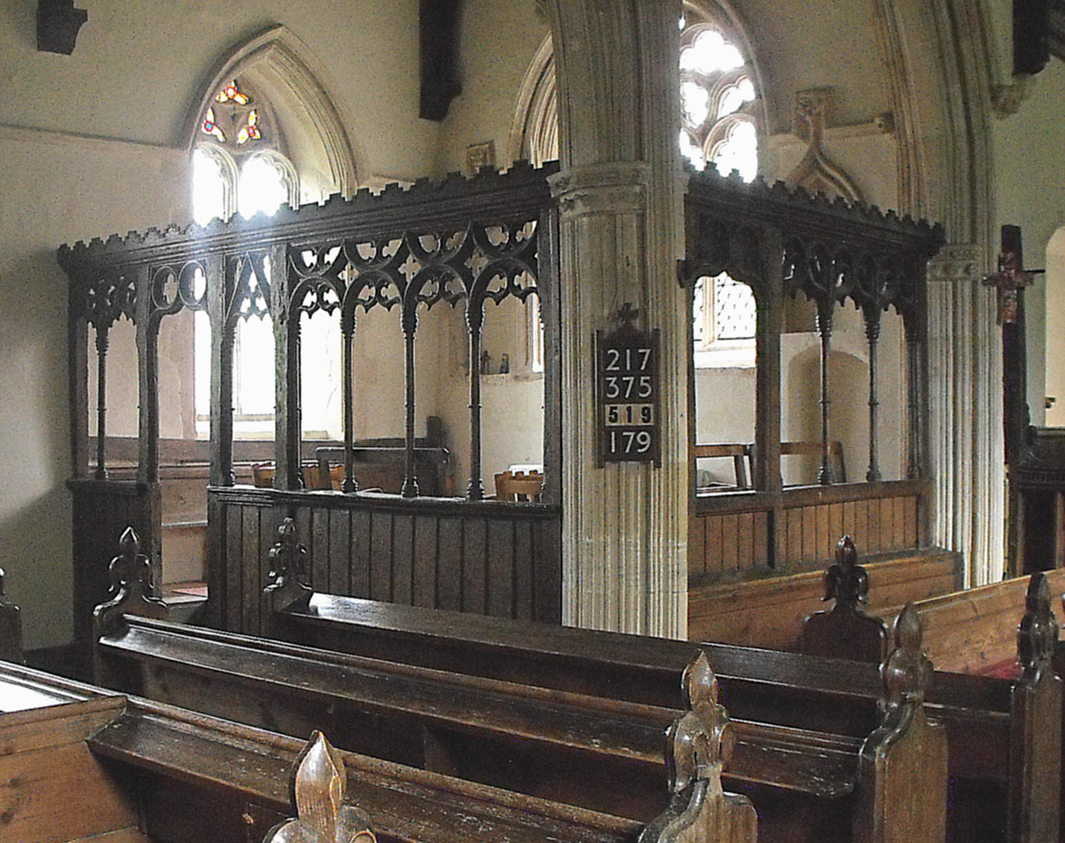 The easternmost bay of the aisle is divided off by a parclose screen to the south and west, to form a chapel approached up three steps. The screen is a very nice piece, with turned muntins, an inverted round arch above each bay, and a castellated top rail (illustrated right, viewed from the southwest). There is a trefoil-cusped ogee niche either side of the E. window.