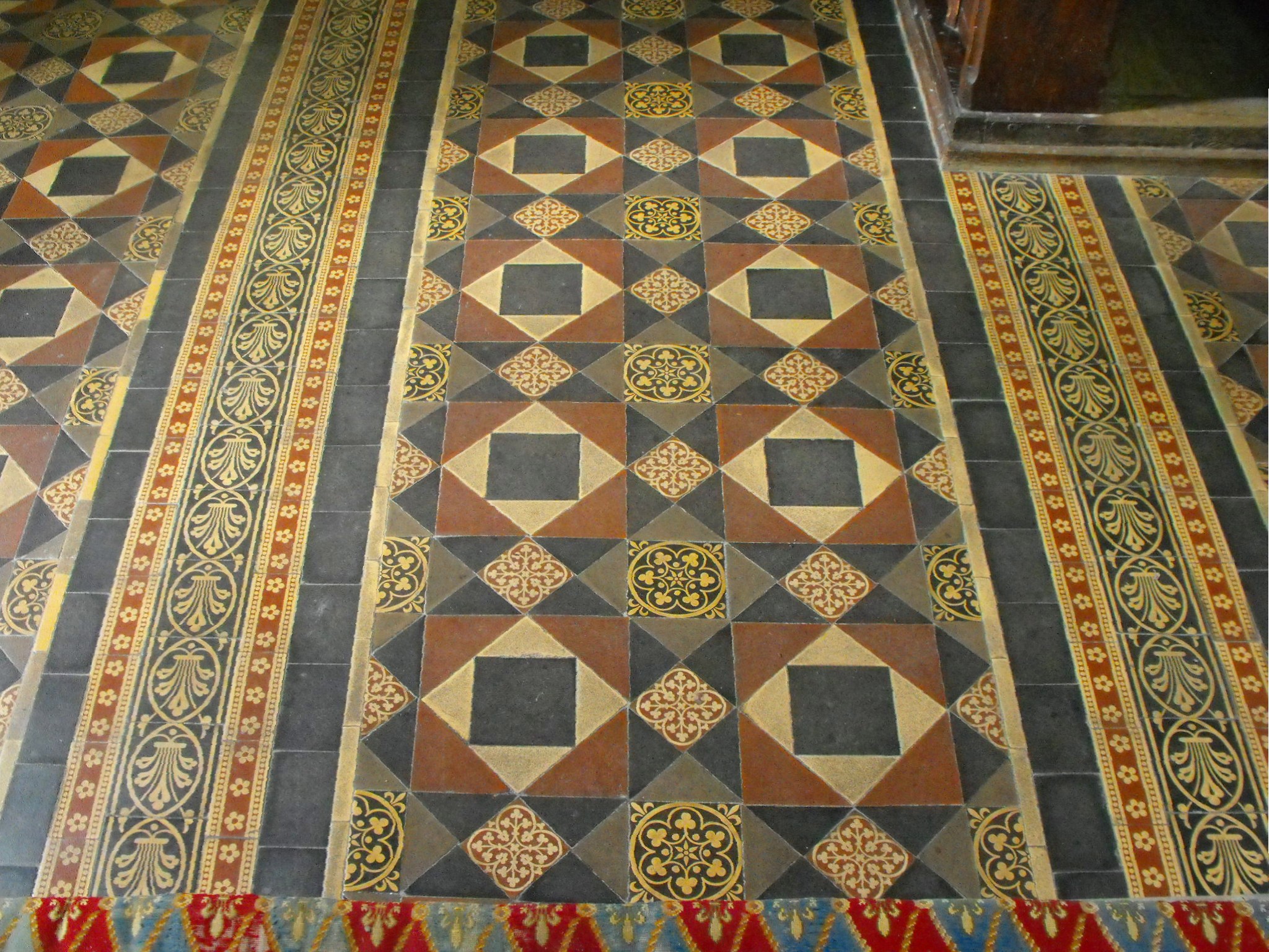 The chancel is approached up two steps. The trefoil-cusped window to the south has a lowered sill to act as a modest sedilia and there is a piscina immediately to the east. The reredos and communion rail are modern and the most attractive feature in this part of the church is the excellent Victorian floor tiling (seen at the foot of the page, photographed from the east).