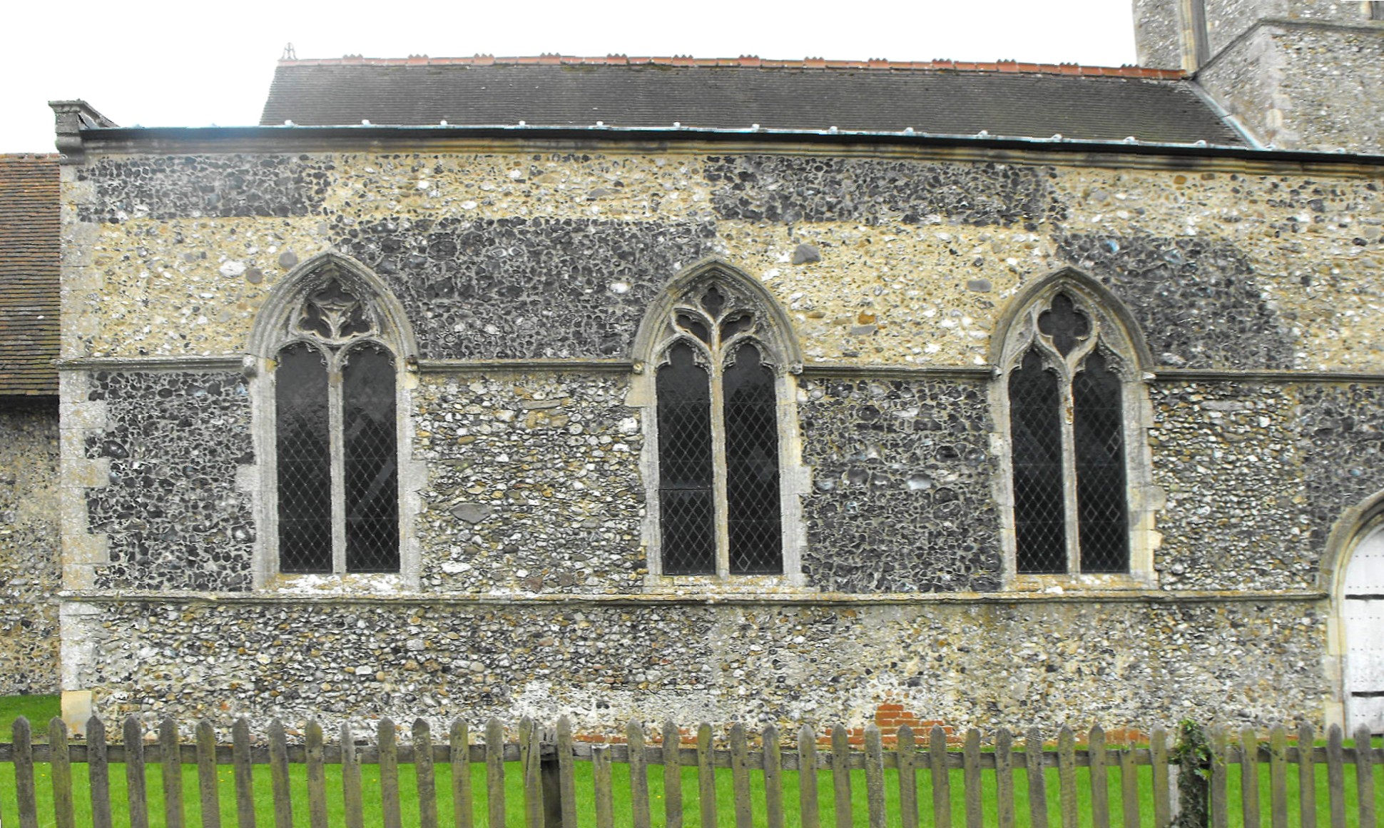 aisle, and an unbuttressed W. tower, the building is constructed of flint
