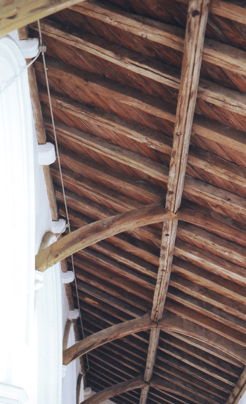 Finally, some woodwork must be mentioned, beginning with the seventeenth century communion rail with twisted balusters and the contemporary hexagonal pulpit on a fifteenth century stem. The choir seats in the chancel retain two old misericords on each side, all defaced. The nave roof of king-post type still retains most of its original main beams, but the aisle roofs are more interesting, especially the lean-to N. aisle roof (seen left, looking towards the west) of, presumably, early fourteenth century date, which is supported by arched braces towards the nave, springing from corbels in the N. arcade spandrels. Similar corbels project from the south side of the S. arcade spandrels, but the S. aisle roof is Perpendicular and partly renewed although it has kept its original and nicely carved principal rafters. The boarded chancel roof is Victorian and has the same intersecting ribs and flat bosses to be seen on the chancel roofs at Hitcham and Rattlesden. The designer is unknown although the church at Rattlesden was restored first by Blomfield in 1883 and then by someone who might possibly have been Butterfield in 1893.