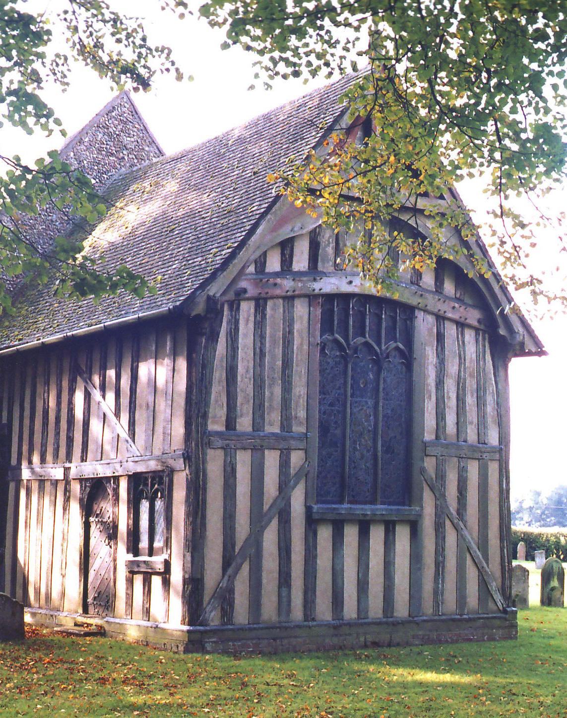 The half-timbered S. porch has four-light, square-headed side windows with moulded mullions, and an outer doorway with a very depressed arch, above which there is just sufficient room for a little encircled trefoil in the spandrel on the left. The bargeboard in front of the gable is decorated with more trefoils and, inside, the roof is supported by a cambered tie beam with traceried spandrels decorated with flowers and bunches of grapes.