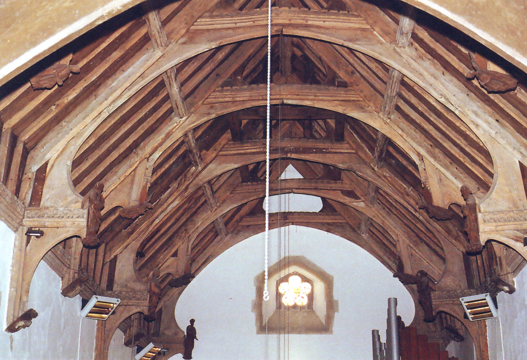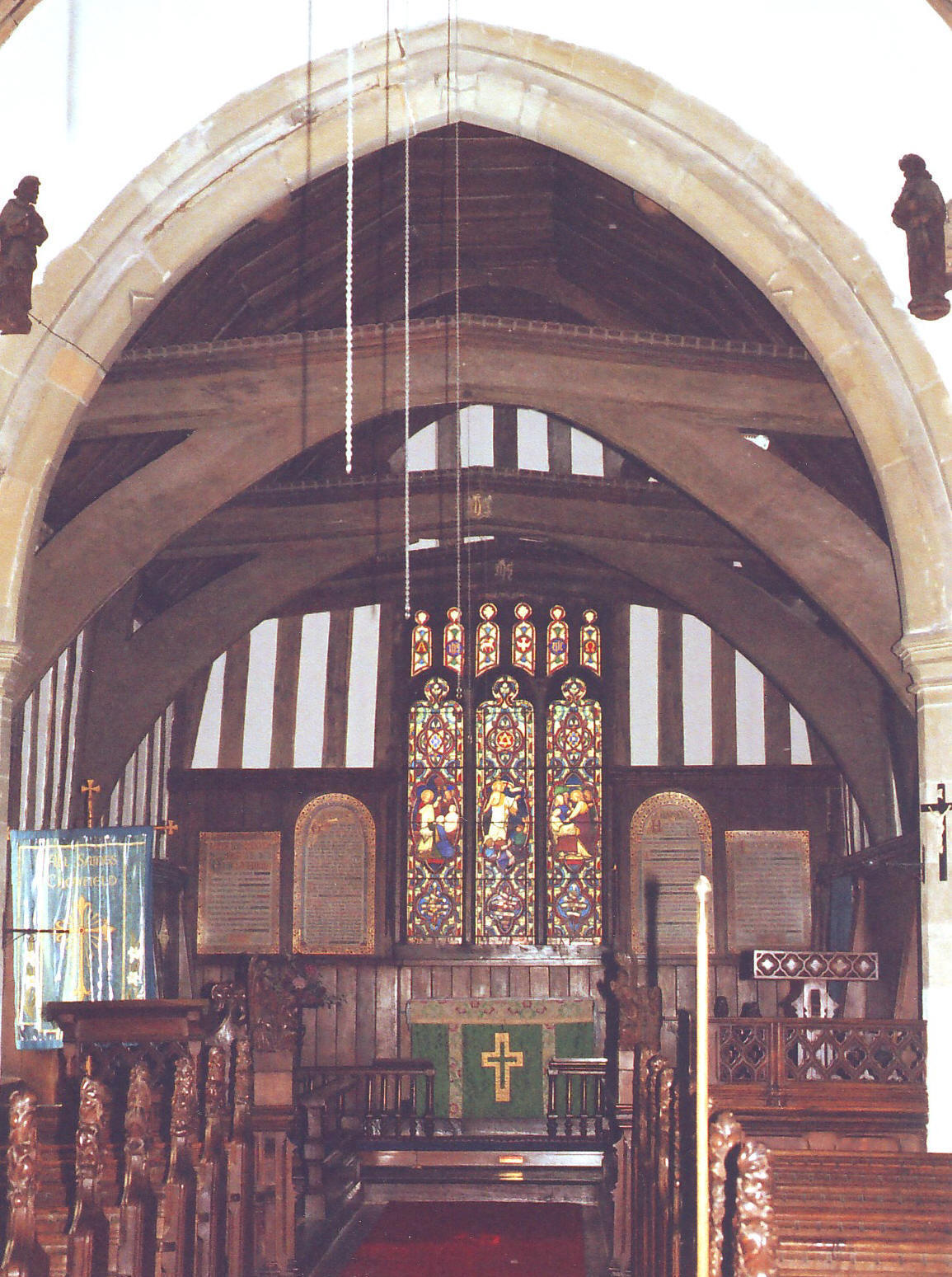 The rest of the building - formed of a nave with a lean-to N. vestry and a surmounting bell-turret towards the west - is Victorian work of the poorer sort, and it is no surprise to discover the architect was Edward Charles Hakewill, whose family included at least four indifferent members of that profession, much of whose work appears characterized by ungainly window traceries. That is certainly the case here, as witnessed by the three-light nave window on either side towards the east, each displaying a supertransom joining the apices of the lancet subarcuations above the outer lights, and creating by this simple expedient, a design ingenious for its ugliness. Inside, they are arguably still worse, for each is backed by two heavy trefoil-cusped arches, supported on a thick central shaft. The nave roof (shown above left, from the east) is not much better, though Hakewill cannot be blamed for this as it appears largely to have been re-used. It is the very model of indecision, reflected in the curious alternation of hammerposts braced to collars, with arched braces divided into two tiers and pendants between, attached to the principal rafters below the line of the purlins. |