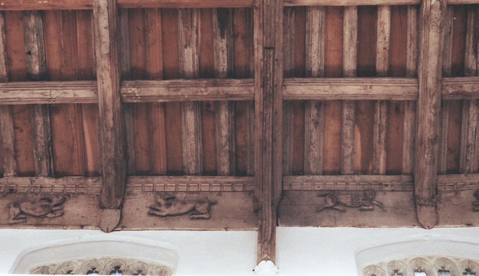 The roof (of which a detail is shown right) is an excellent piece of carpentry of couple form, decorated with carved animals (hares, dogs, lions, deer, etc.) on the cornices, more of which can be found on the lean-to aisle roofs. The purlins, rafters and braces of all these are original, although the new boarding is visible above. However, there is a lot of other rewarding carpentry in the church, much of it mediaeval.