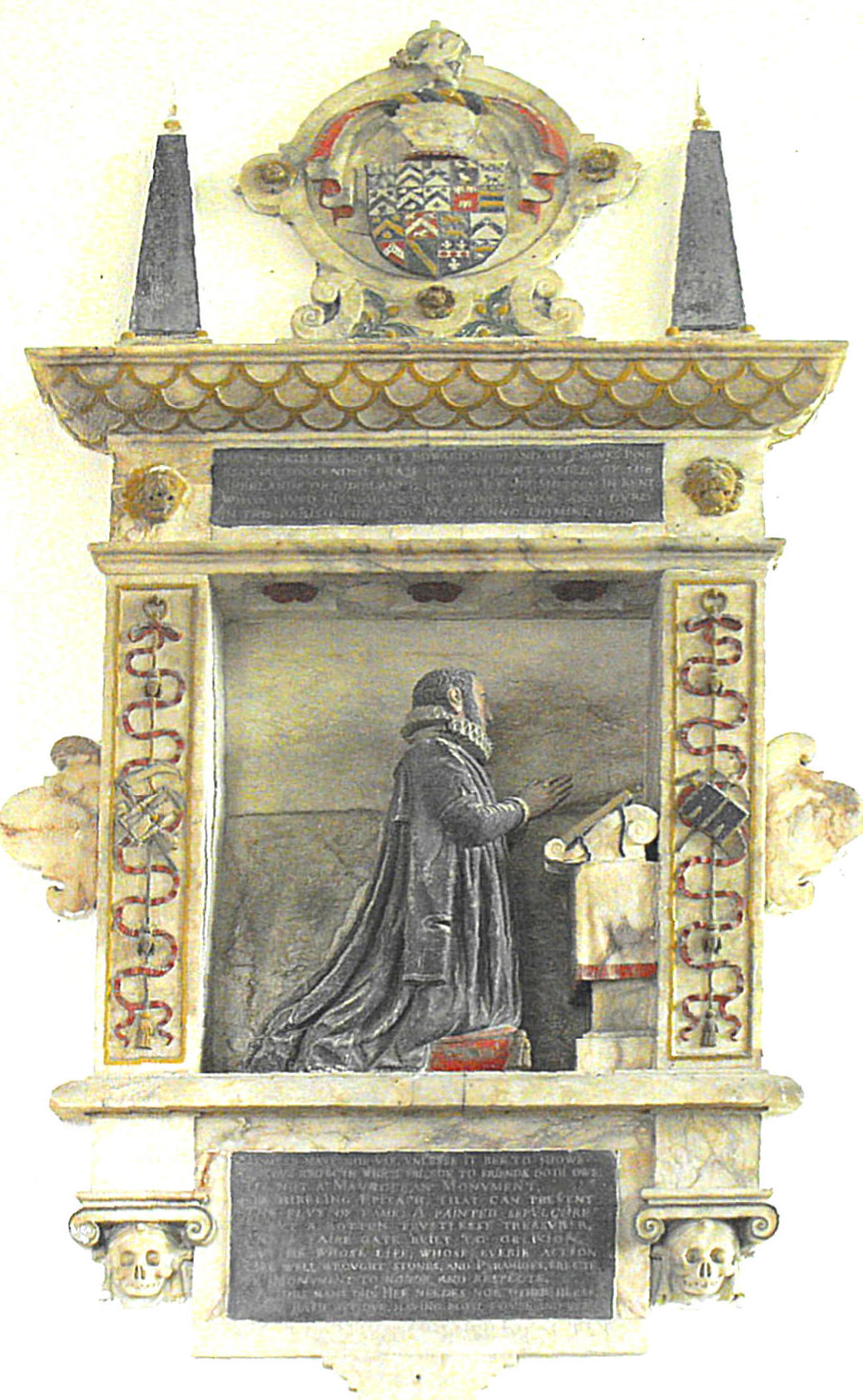 Finally, the church contains one significant monument (shown below), commemorating Edward Sherland (d. 1609), featuring an effigy of he deceased kneeling at a prayer desk, set within an architectural surround, surmounted by two obelisks and an achievement above. The beautifully composed inscription reads: ![]()