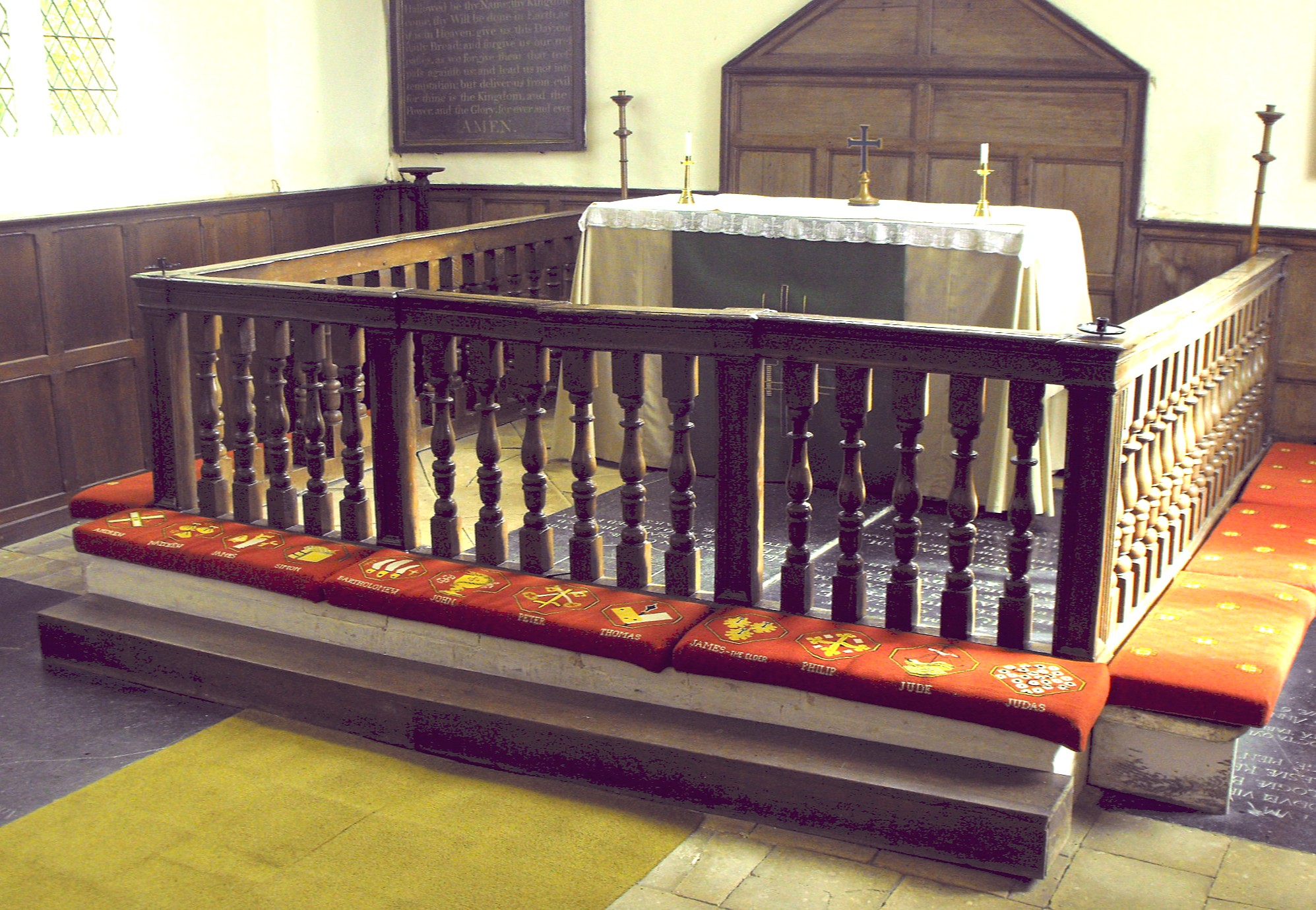 The most significant item of carpentry in the chancel is the 'Laudian' communion rail (below), which characteristically surrounds the altar on three sides and may or may not date precisely from archiepiscopacy of William Laud, between 1633 and his execution in 1645. The sill of the easternmost window in the S. wall is dropped to act as a sedilia and an angle piscina built into the eastern splay, opens in little trefoiled arches, north into the sanctuary and northwest towards the main body of the chancel, on either side of an octagonal support.
