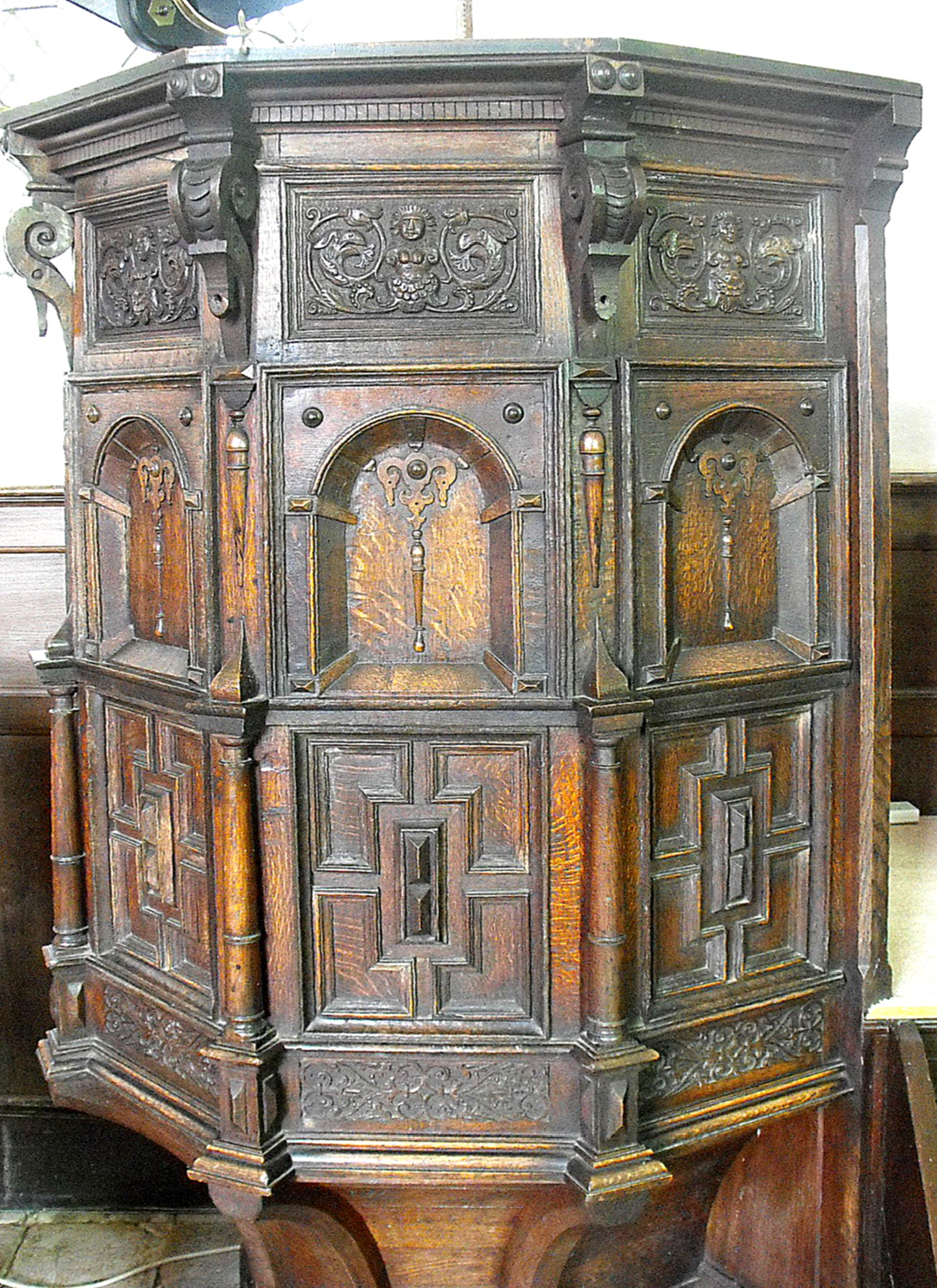 Inside the building, other matters come to the fore. The nave is approached down three steps, the unmoulded chancel arch (such as it is) simply dies into the walls, and there is a gallery over the W. end of the nave, behind which the lower stage of the tower is now partitioned off to form a vestry. The nave walls are strikingly battered, giving an impression of a building splaying outwards under the weight of the roof. The church guide describes this method of construction as a 'design ... used in flint and rubble construction [to provide] stability', but it is not a technique that is frequently encountered, at least to this extent. The nave roof is ceiled, although the ashlar pieces remain exposed above the wall plates. The especially fine pulpit (above right) may be late Elizabethan rather than Stuart: the blank perspective arches on the second tier of panelling are not of standard Jacobean type and the bare-breasted mermaids(?) carved in the tier above, are reminiscent of the more prominent full-bosomed caryatids on the late sixteenth century pulpit at Orton Waterville (Peterborough). The font is presumably Norman: it consists of a big square bowl supported on five circular shafts and a large square base. Other features in the nave include a Royal Arms of George II over (as opposed to above) the N. door, and the remains of the rood stair in the nave S. wall, immediately west of the chancel arch.