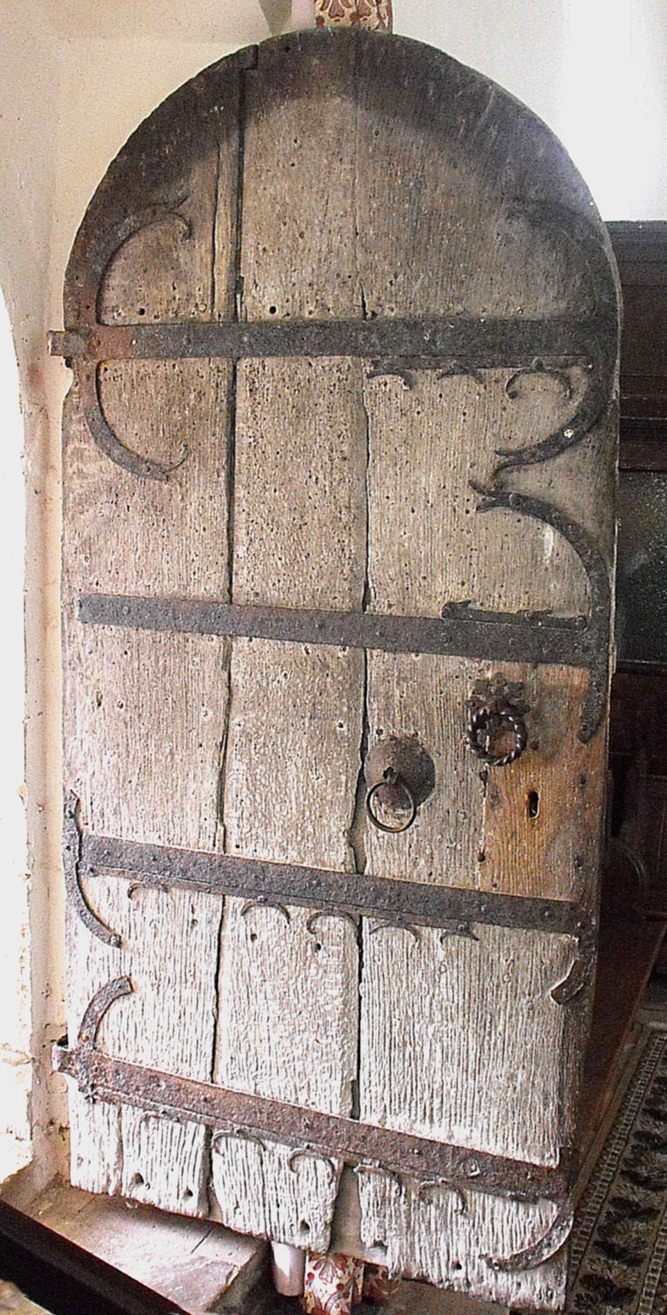 The chancel is lit by two renewed S. windows with reticulated tracery, a restored E. window with flowing or curvilinear tracery and, to the north, two Y-traceried windows on either side of a third with a straightened reticulation unit in the head - a very compendium of late thirteenth and fourteenth century window tracery design. The nave N. wall boasts another Y-traceried window, a second blocked Norman window, and two more windows with straightened reticulated tracery (commensurate with the late fourteenth century) on either side of the N. doorway. The tower rises in three stages, supported by diagonal buttresses for the lower two, to lancet bell-openings and superimposed shallow battlements; it is lit to the west by two further lancets, a small one below and a large one above, and retains a fossilized gable line on the E. wall, above the present nave roof, that probably looks back to the time when the roof was thatched. The porch has been heavily restored although it retains its outer, possibly thirteenth century, wooden cruck arch, but more important than this is the ancient inner door (illustrated below left), which, as the church guide points out (Rev. Tim & Trish Ffrench, St. Peter's Church Guide, undated, pp. 3 & 5), is almost certainly a survivor from the original building and older than the doorway in which it now hangs. Round-headed and formed of four vertical planks, with its Norman iron-work still attached, it was described by the late Dr. Oliver Rackham as having 'the earliest tongue and groove boards known to me, re-used in the Early English doorway, which it does not fit' (cited from the church guide).