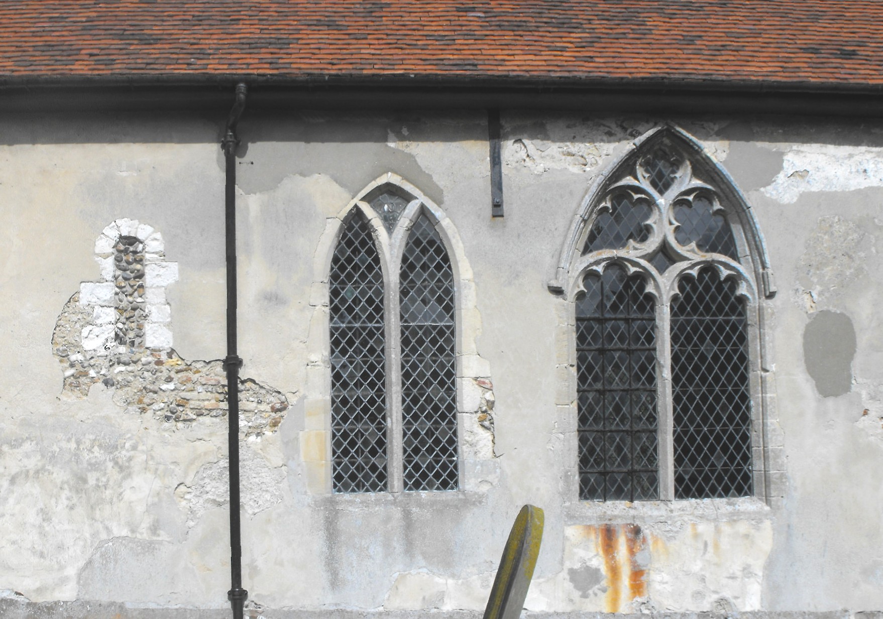 The four and a half lines written on the structure (as opposed to the furnishings) of this interesting church in The Buildings of England (in the 'Suffolk West' volume by Nikolaus Pevsner and James Bettley, New Haven & London, Yale University Press, 2015, pp. 222-223), does the building scant justice albeit the nave S. wall can speak for itself for here in a row, conveniently laid out from left to right, is a little blocked Norman window, probably dating from the twelfth century, a Y-traceried window from the second half of the thirteenth century, and a two-light Decorated window with cinquefoil-cusped lights commensurate with c. 1340-50. (See the photograph below.) Thus the nave is Norman in at least some of its basic fabric, and the majority of the building's features variously derive from the following two centuries. The church is formed of a chancel, a nave with a S. porch, and a W. tower, and is constructed of rendered flint and chalk rubble beneath roofs of red tile.