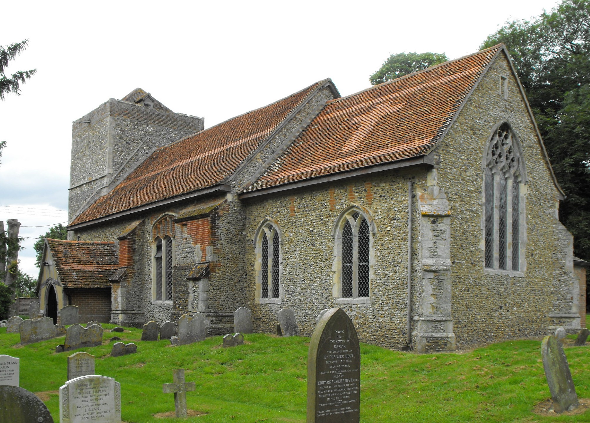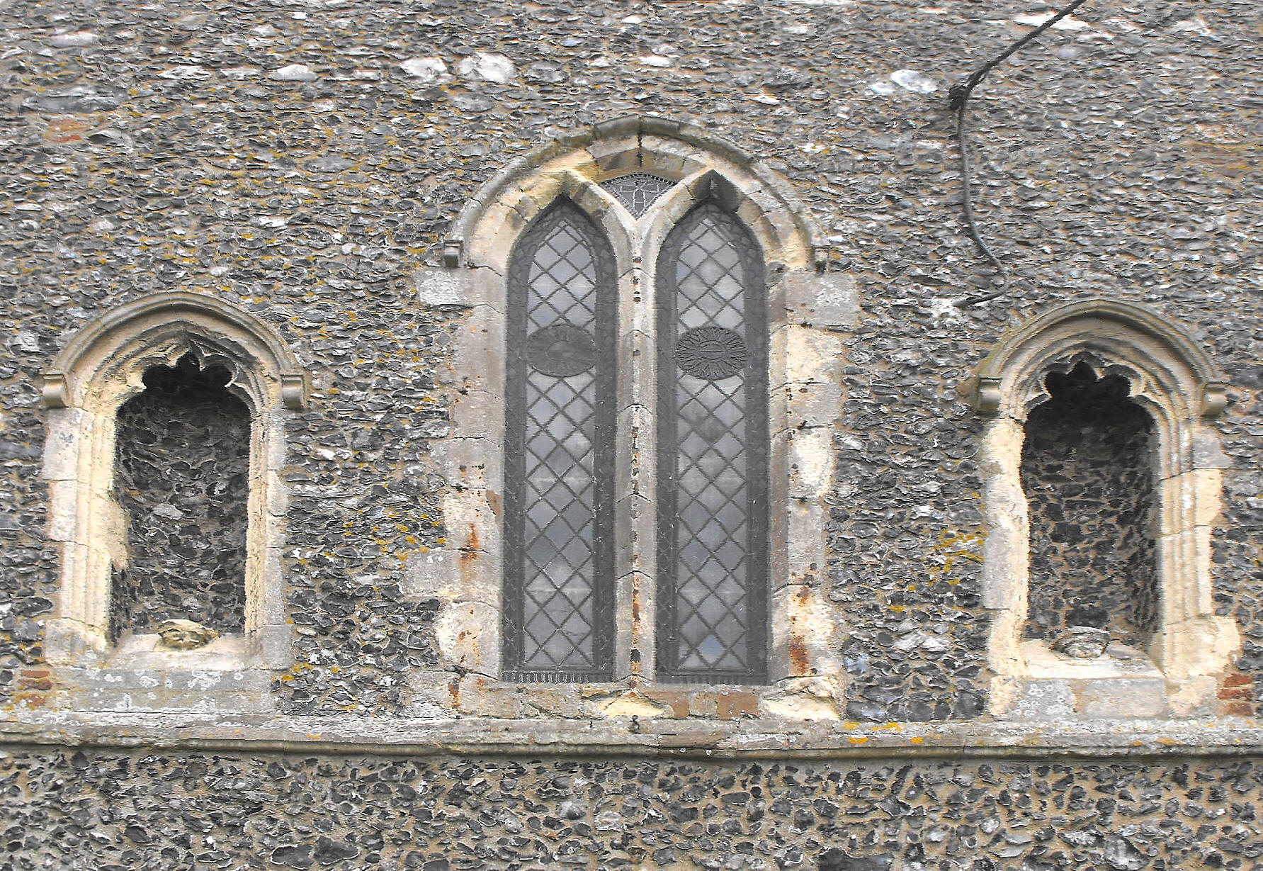 The tower is unbuttressed and constructed of uncoursed knapped flint. Its only surviving opening is the Y-traceried W. window with a slightly flattened arch, suggesting it may be somewhat later than the Y-traceried windows elsewhere. The cinquefoil-cusped niches on either side are probably somewhat later again. (See the photograph, below left.) The remains of a gable-line on the tower E. wall show the nave was once slightly steeper pitched. The tower doorway is cut in the S. wall rather than the W. wall, and internally, the tower arch to the nave carries two flat chamfers, the inner dying into the jambs and the outer continuing uninterrupted all the way round without intervening capitals. The S. porch was originally half-timbered but the sides were rebuilt in brick as recently as 1978-84 (ibid., p. 5). The inner doorway carries two hollow chamfers.