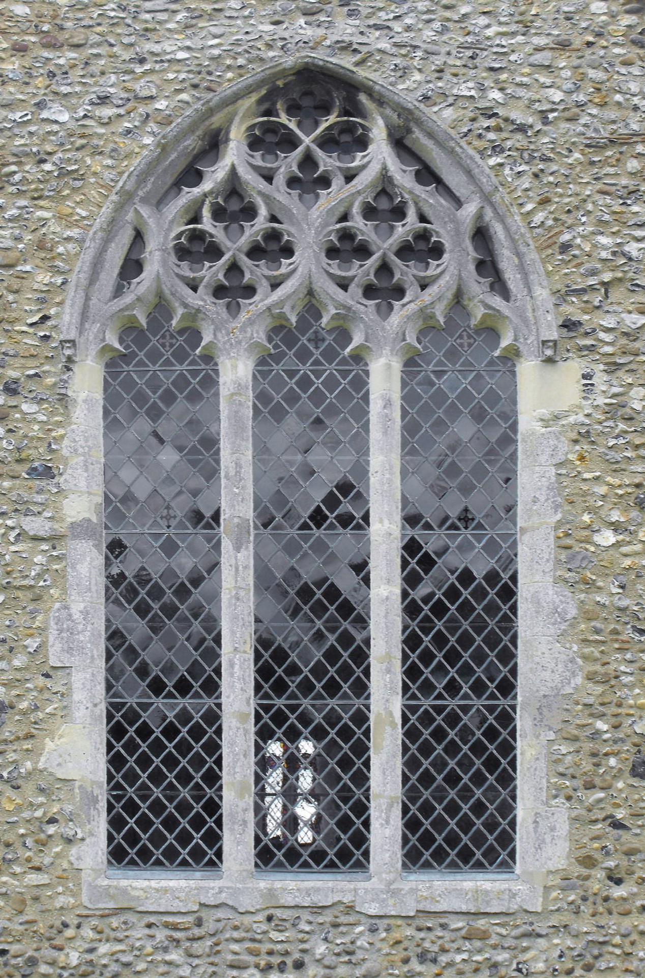 This is a humble little church made humbler by the loss of the tower's bell-stage, probably in 1747, when it appears to have been removed for safety reasons and replaced with the present pyramidal roof (Roy Tricker, St. Mary's Church, Flowton, Suffolk, 2010, p. 4). The surviving building is predominantly late thirteenth century in date. The nave is lit by two archetypal Y-traceried windows to the north and one to the south (to the west of the porch) and the chancel, by two to the south and one to the north (the latter, visible only inside, where it now looks through to the vestry). The chancel E. window is an extremely handsome Decorated insertion, composed of cinquefoil-cusped ogee lights and reticulated tracery filled with cruciform lobing set vertically. (See the photograph below left.) Windows of similar design are to be found at Nedging and Stansfield among other places, but this is the best example. The three-light, four-centred window in the nave S. wall to the east of the porch, has supermullioned tracery in moulded Tudor brick, and immediately east again, there is an exceptionally wide protruding section of masonry that once enclosed the rood stair (as illustrated above and below right).