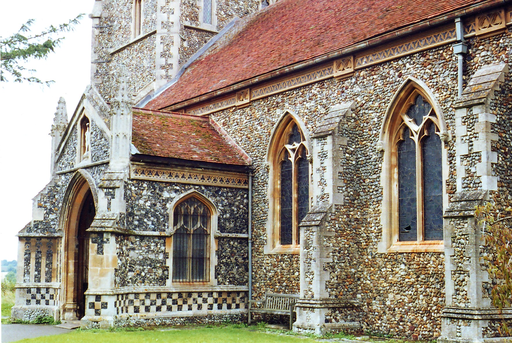 Phipson’s commission at Great Finborough involved the construction of a new and expensive church on the site of its little predecessor, and the only mediaeval work he re-used was the two, two-light Decorated windows with curvilinear tracery, now opposite each other at the western end of the nave (to the west of the S. porch). The new building consisted of a tall tower with a spire, a nave and a chancel, with assorted additions to the north comprising a N. transept serving chiefly as a chapel to members of the Wollaston and Pettiward families, a lean-to organ chamber against the transept’s E. wall, and a cross-gabled vestry, further east again. The greatest design effort and the majority of the money, seems to have been spent on the exterior of the church, for the interior is relatively plain and uninteresting and Phipson seems to have been concerned to demonstrate his skill in two principal ways - first, in the form of the highly successful tower and spire, and second, in his admirable handling of the construction materials (as apparent in the photograph of the porch and S. wall of the nave, below), which consist of an admixture of grey flints and brown cobbles that seldom look better than they do here, offset as they are by prominent limestone dressings and string courses. The nave and porch walls are topped, just beneath the eaves, by an attractive narrow frieze in structural polychromy, featuring trefoils and quatrefoils, and these are transformed above the chancel into an equally successful corbel table formed of little trefoil-cusped arches. Their intricacy has the effect of drawing the eye away from the windows, which adopt a variety of simply-drawn Second Pointed Gothic forms, albeit forms that in no instance look convincingly mediaeval and were probably not intended to do so. However, these rather ordinary windows actually contribute to the success of the building, for elaborate window traceries would have attracted attention away from Phipson’s treatment of the masonry, over which he has taken a care worthy of Butterfield.
