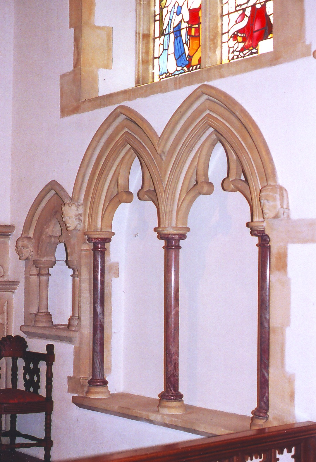 Inside the building there is rather less to see but the assortment of monuments in the transept, mostly from the old church, may detain the visitor awhile. The most curious feature is the way in which the collar-beamed nave roof, constructed in six narrow bays, is so conspicuously at odds with the five wider bays of the nave itself, a discord for which there is no obvious explanation. The chancel roof is scissor-braced above collars and the chancel has a plain N. arch opening to the organ chamber and a double sedilia with piscina beyond (shown below left), recessed in the east end of the S. wall, formed of trefoil-cusped arches supported on brown marble columns and with head label stops at the sides. The chancel arch carries a series of mouldings above semi-octagonal responds, and the tall tower arch has a complex profile organized into what are, in effect, three distinct orders. The font comprises an octagonal bowl of buff-coloured sandstone, supported on eight circular columns of streaked red marble. It is quite a nice piece but no match for some of Butterfield’s fonts composed of contrasting stones.