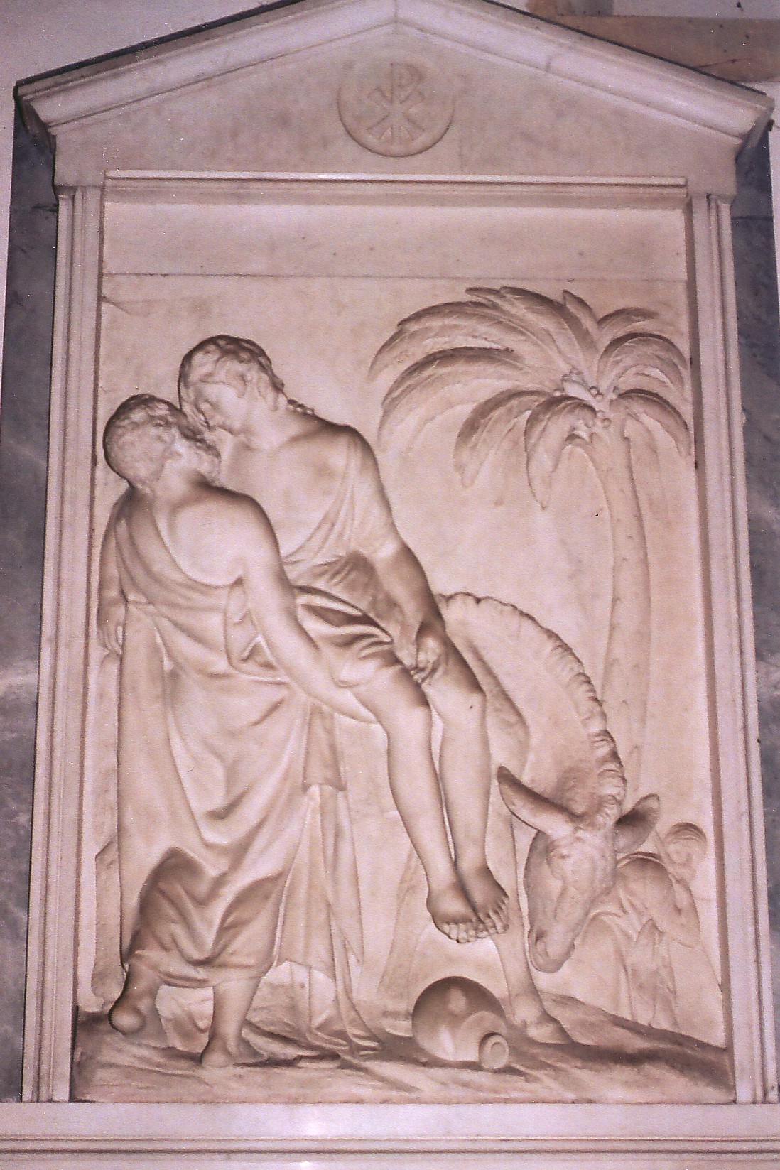 The most prominent monument in the church is that commemorating Roger Pettiward (d. 1833), boasting a large panel depicting the story of the Good Samaritan (as illustrated above right), featuring, beside the two figures, an ass and a palm tree. It is the work of Sir Richard Westmacott (1775 - 1856), one of three late eighteenth and early nineteenth century monumental sculptors of that name, being the son of Richard Westmacott the Elder (1747 - 1808) and father of Richard Westmacott the Younger (1799 - 1872), and being of these, both the most prolific and most famous artist, though not necessarily the best. His figures here, for example, while more than competently done, are heavy in comparison with his father’s monument to James Lennox Dutton (d. 1776) in St. Mary Magdalene’s church, Sherborne (Gloucestershire), where the subject of an angel trampling death provided the elder Westmacott with an excuse for a sensitive and sensuous celebration of the female form. |