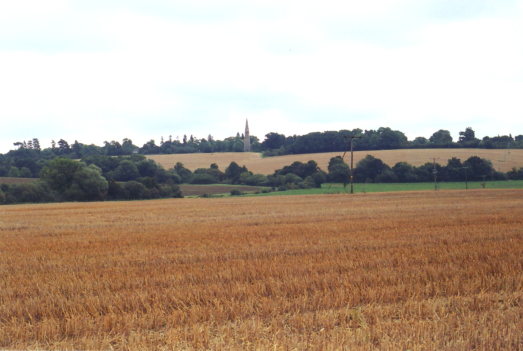 Nevertheless, Phipson’s greatest achievement at Great Finborough is actually to be seen in the tower, and it comes as a surprise to learn that the spire was something of an afterthought for it now seems absolutely integral to the church’s success. The tower rises first in three diagonally-buttressed square stages with a stair turret projecting at the eastern end of the N. wall and with supporting diagonal buttresses that subsequently reach across as squat flying buttresses to the diagonal faces of the octagonal bell-stage - which, by its reduced size, adds greatly to the apparent lightness of the structure - with bell-openings displaying a variant of reticulated tracery piercing the cardinal sides. The tall spire sits flush upon this (i.e. without recess) and rises to a needle point, lit by two tiers of lucernes and faced alternately by red-brown and buff stone in bands of harmonious but irregular widths. The whole composition forms a prominent landmark across the fields for a mile or more all round (see the photograph below, taken from the west), yet its slender silhouette ensures that it fits comfortably into the landscape, notwithstanding its distinctly alien basic form.