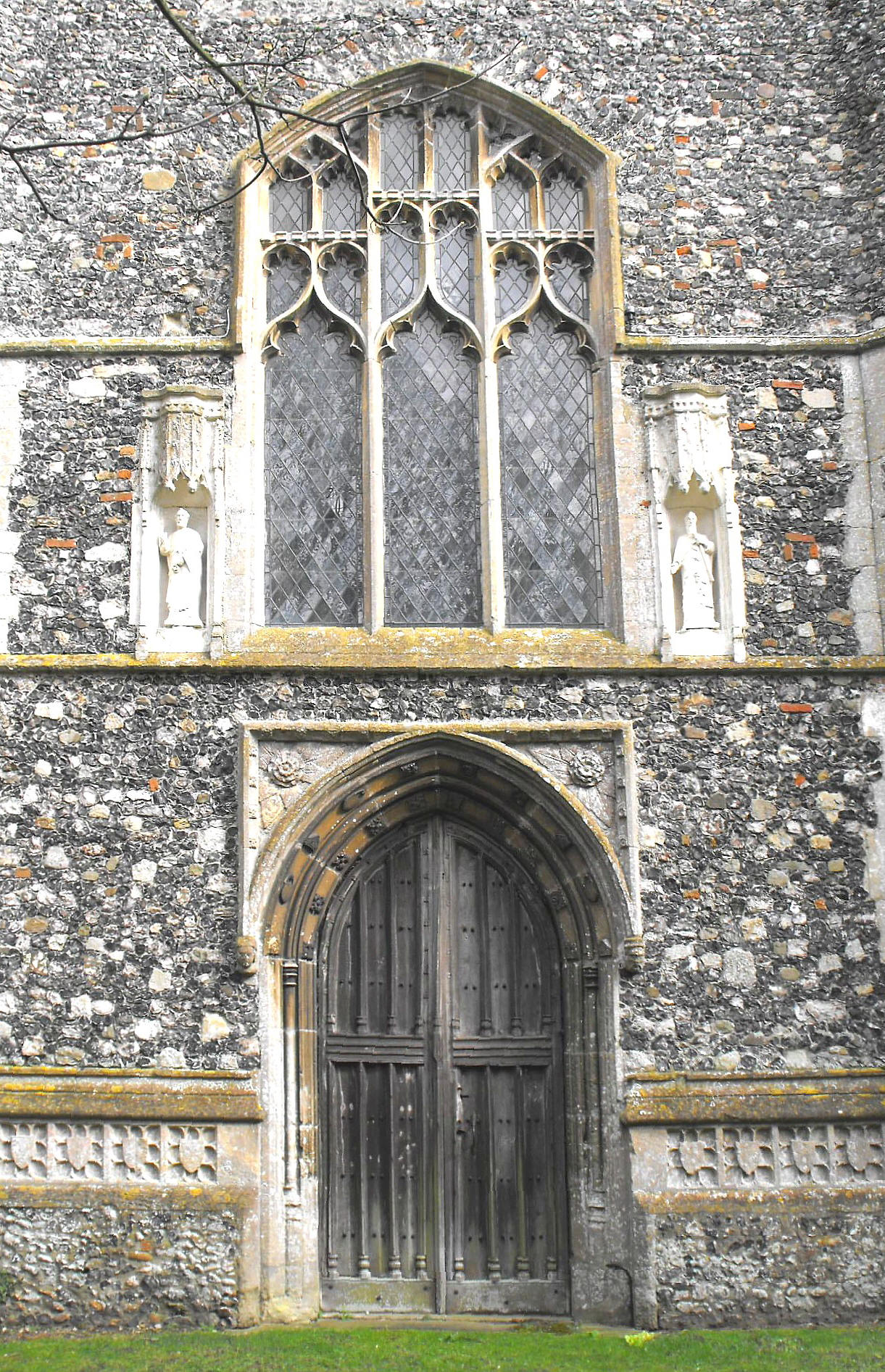 Externally, however, everything is Perpendicular and characterized by the colour contrast between walls faced in knapped flint and dressings cut from a more than usually creamy freestone. The tower is believed to date from c. 1450 and rises in four stages supported by diagonal buttresses with flushwork arches decorating the leading edges, to three-light supermullioned bell-openings and more flushwork on the battlements. It is lit to the west by a three-light window with drop supermullioned tracery divided by stepped castellated supertransoms, there are canopied niches at the sides, holding (presumably modern) statues of St. Peter & St. Paul, and the W. doorway below carries two sunk chamfers decorated at intervals with fleurons and shields (on the inner and outer order respectively), supported on jambs with an order of attached bowtells. (See the photograph above right.) String courses are prominent and coincide with the buttress set-offs, but the most distinguishing feature of all is the way in which the semi-polygonal projection for the stair turret at the eastern end of the S. wall, turns wholly octagonal at the bell-stage, producing an unusual and successful conceit (as seen above left).