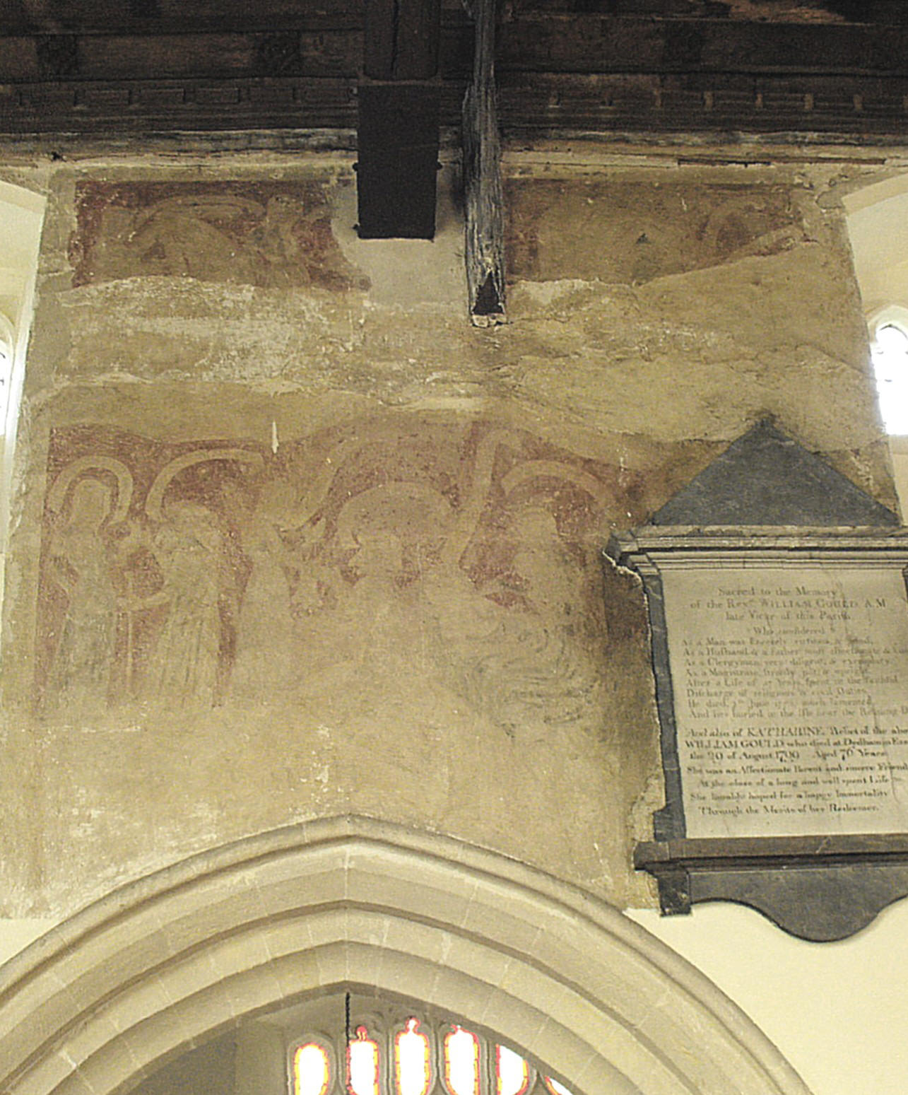 On entering the church, however, it is this six-bay N. arcade that one notices first. (See the photograph above, taken from the east.) It is commensurate in style with a date around 1320, and composed of low arches bearing a hollow chamfer on the inner order and a flat chamfer on the outer order, springing from octagonal piers with characteristic early fourteenth century, prominent capitals. The wall paintings above, though predictably now faint, are probably contemporary and depict, from left to right, St. Christopher carrying Christ across the river, the Seven Deadly Sins portrayed as fruits on a tree, a scene showing acts of mercy (shown below left), and a final scene showing the Last Judgement.