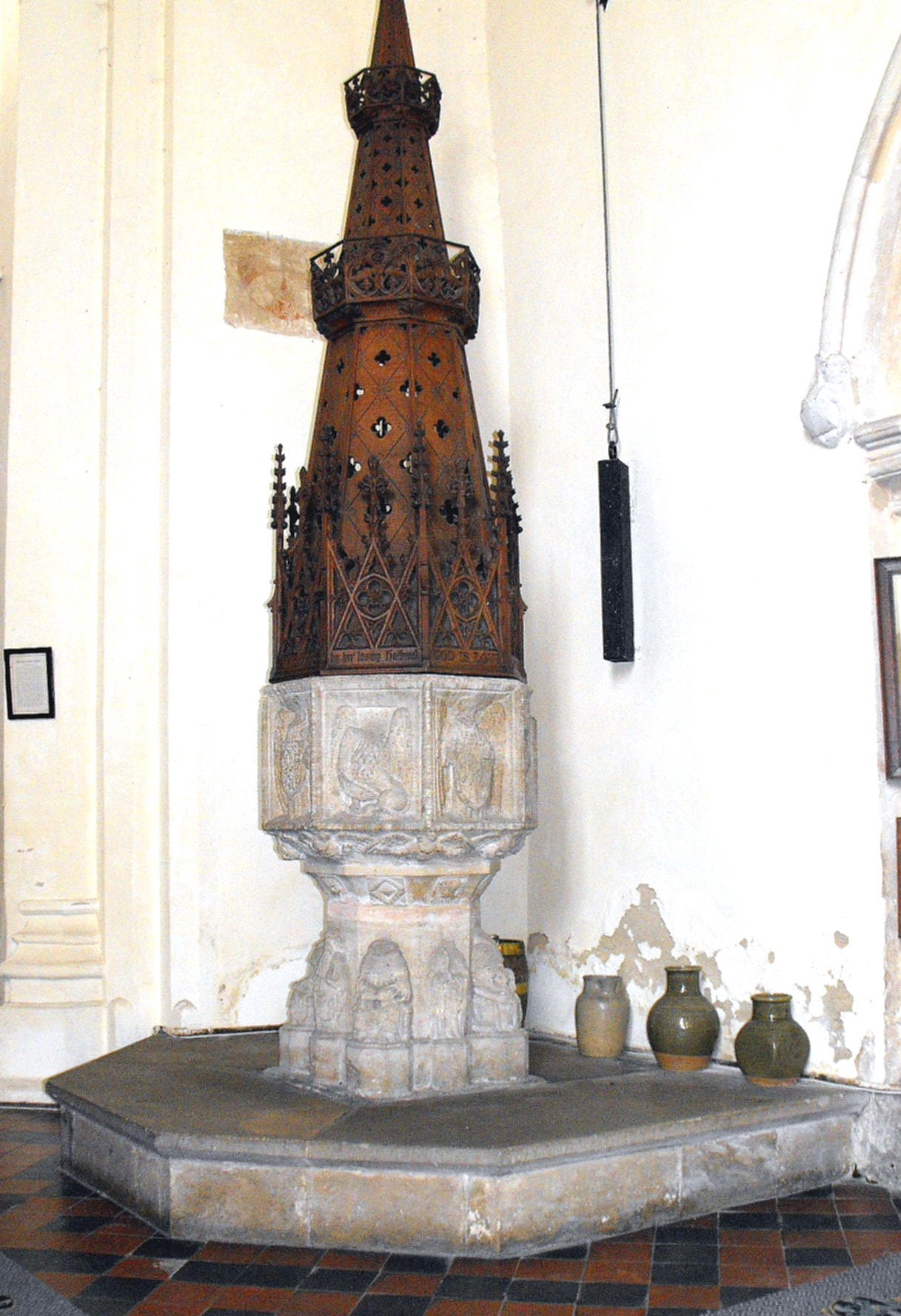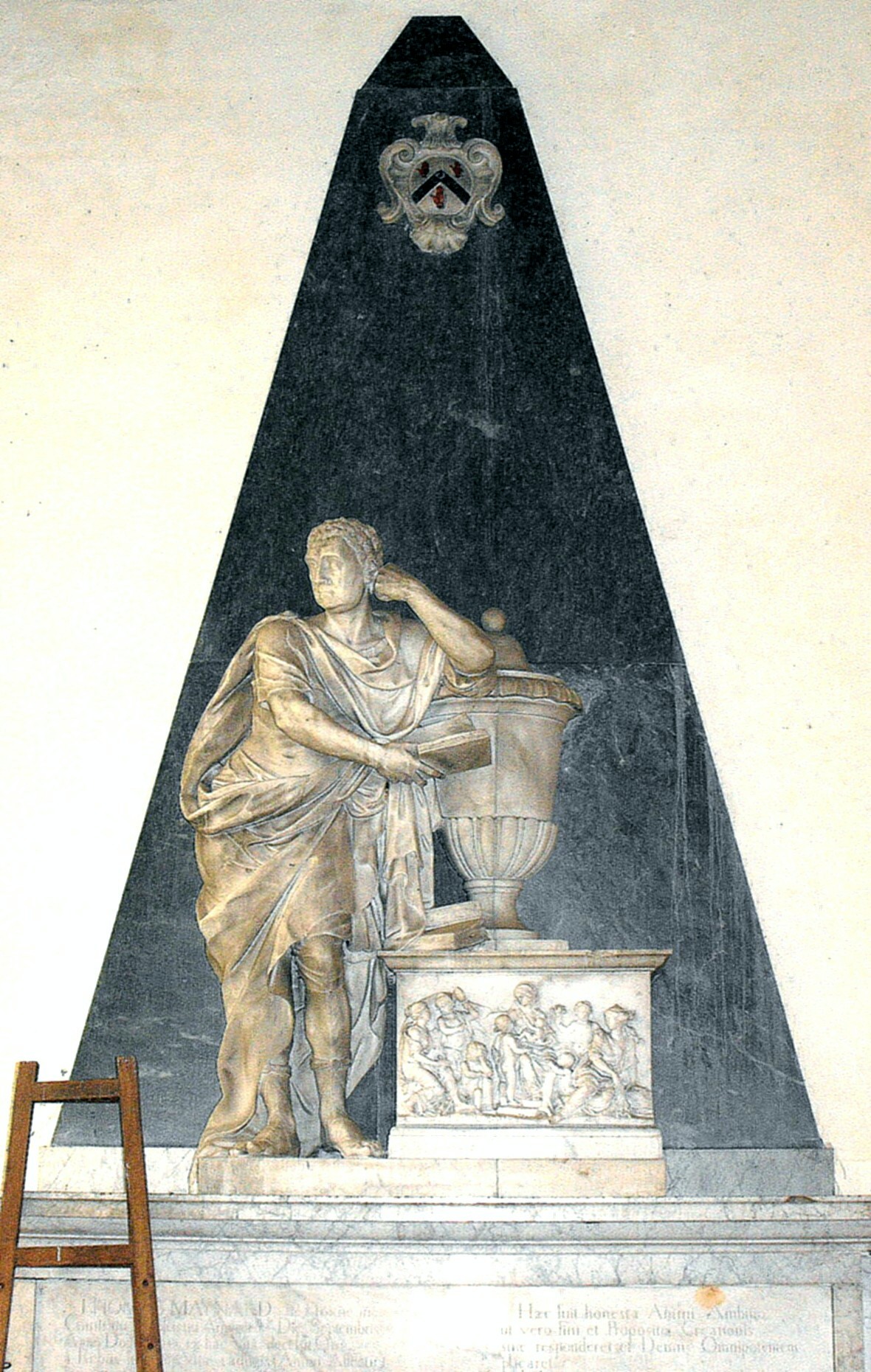 Other features to notice in the building must begin with the font (above right), which has an octagonal bowl bearing the usual emblems of the Evangelists alternating with angels bearing shields, supported on a stem with eight figure supporters around it, all bar one of which have been decapitated. This is a common design in this area but this font is interesting for being capable of close dating by the arms of Bishop Lyhart of Norwich (E. face), who held the bishopric from 1446-1472, and the arms of the second Duke of Suffolk and his wife (S. face), who were married in 1460, which thus together narrow its date of construction down to the years 1460-72 (notes in the church). The church contains no woodwork of real significance but the N. aisle contains a large and important monument commemorating William Maynard (d. 1742) (below) by the Danish-born Charles Stanley (1703-61), which, together with his monument to the same family at Little Easton in Essex, was considered by Rupert Gunnis to be his best work (Dictionary of British Sculptors; 1660-1851, London, The Abbey Library, 1951, p. 365-366). The monument features William Maynard in Roman dress, leaning nonchalantly on an urn and holding a book in his right hand, which stands on a pedestal on the base of which his wife and eight children are depicted in relief and not, pace Gunnis, 'reliefs of "Justice", "Charity", "Faith", etc.'. However, a second monument mentioned by Gunnis and dedicated to Sir Thomas Maynard Hesilridge (d. 1818), can be seen above the door to the vestry, and is by Sir Charles Legatt Chantrey (ibid., p. 95), one of foremost sculptors of his day who amassed a great fortune and left £150,000 on his death. His many statues in famous places include those of Sir William Pitt the Younger in Hanover Square and of George IV mounted on a horse in Trafalgar Square, which was executed in 1829, nine years after he had also carved a bust of the king for which George IV had insisted on paying three hundred guineas - one hundred more than the asking price!