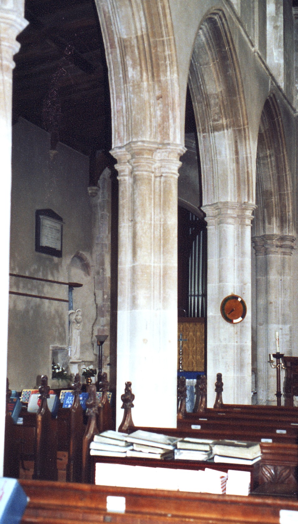 The independently-gabled, Victorian organ chamber-cum-vestry aside, this church dates essentially from two periods - the early fourteenth century and the mid to late fifteenth. The early fourteenth century (Decorated) work has been heavily restored, however, and is not of great interest. It comprises the chancel in particular and, most probably, the basic masonry of the nave and aisle walls, including the double-flat-chamfered N. doorway with hood-mould supported on leaf-carved label stops, and the S. doorway inside the porch, which has a little niche with a gabled canopy above. The three-light chancel E. window with curvilinear tracery may be wholly a nineteenth century design, but externally to the left, the blank cinquefoil-cusped ogee arch is old (albeit of unclear function), and the two, two-light curvilinear windows in the S. wall appear mediaeval internally, while the double piscina to the east, beneath cinquefoil-cusped arches, is certainly original and perhaps earlier than c. 1320 to judge by the absence of ogees. Opposite, on the other side of the sanctuary, an unglazed two-light window with segmental-pointed arch and cinquefoil-cusped Y-tracery above a recessed round-arched monument to Richard Coddington, now looks through to the vestry. The chancel arch is formed of two flat-chamfered orders supported on semi-octagonal responds, but it is the profile of the capitals that reveals the date most clearly.