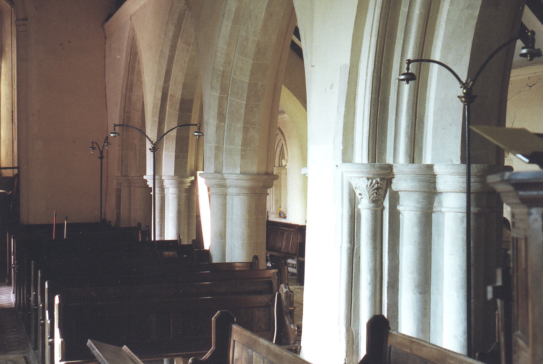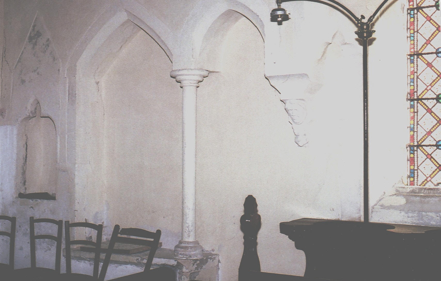 However, it is the church interior which is most instructive. Here, rather surprisingly, the three-bay N. arcade (shown above, from the east) proves to be essentially mediaeval, albeit restored (cf. the unaltered stone bases), and to consist of double-flat-chamfered arches springing from quatrefoil piers, while a fourth and separate arch beyond (in the immediate foreground in the photograph), in similar style though with an extra order of shafts to the south, opens from the chapel to the nave and, east again, a large trefoil-cusped squint looks through to the chancel. All this could be contemporary with the tower, yet the chancel itself is of the crudest construction and has an arch to the nave bearing only the narrowest of chamfers above jambs without responds and internal walls covered with the most muddled arrangements of blank arches around its assorted features which - even allowing for the alterations of the centuries - is clearly the outcome, above all else, of incompetent design. Thus the S. wall (shown below) holds a sedilia of two unequal, hollow-chamfered bays separated by a circular shaft, with an oddly-placed corbel head beneath to the west and a simple trefoil-cusped piscina to the east, but what is most striking is that none of the elements really fit their allotted spaces. Nor is the N. wall any better, for here the priest’s doorway (which now leads to the vestry) is so narrow as to admit only the most emaciated of incumbents, while to right and left are two further blank arches of quite different dimensions, the latter springing from another inconveniently-placed corbel head. It seems likely that all this was done a few decades before the decision was taken to add the aisle and chapel, by which time, mercifully, a different mason had been engaged.