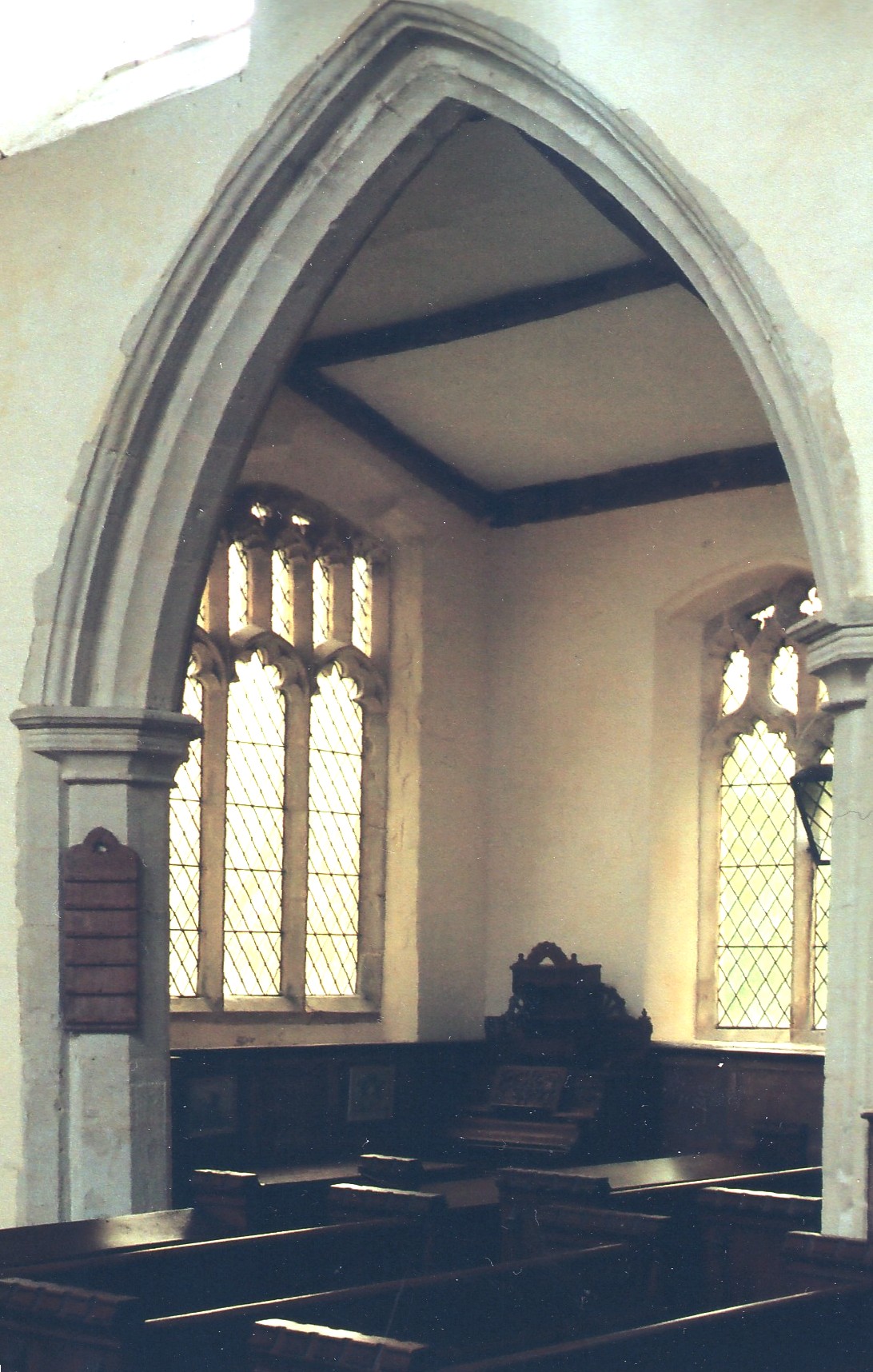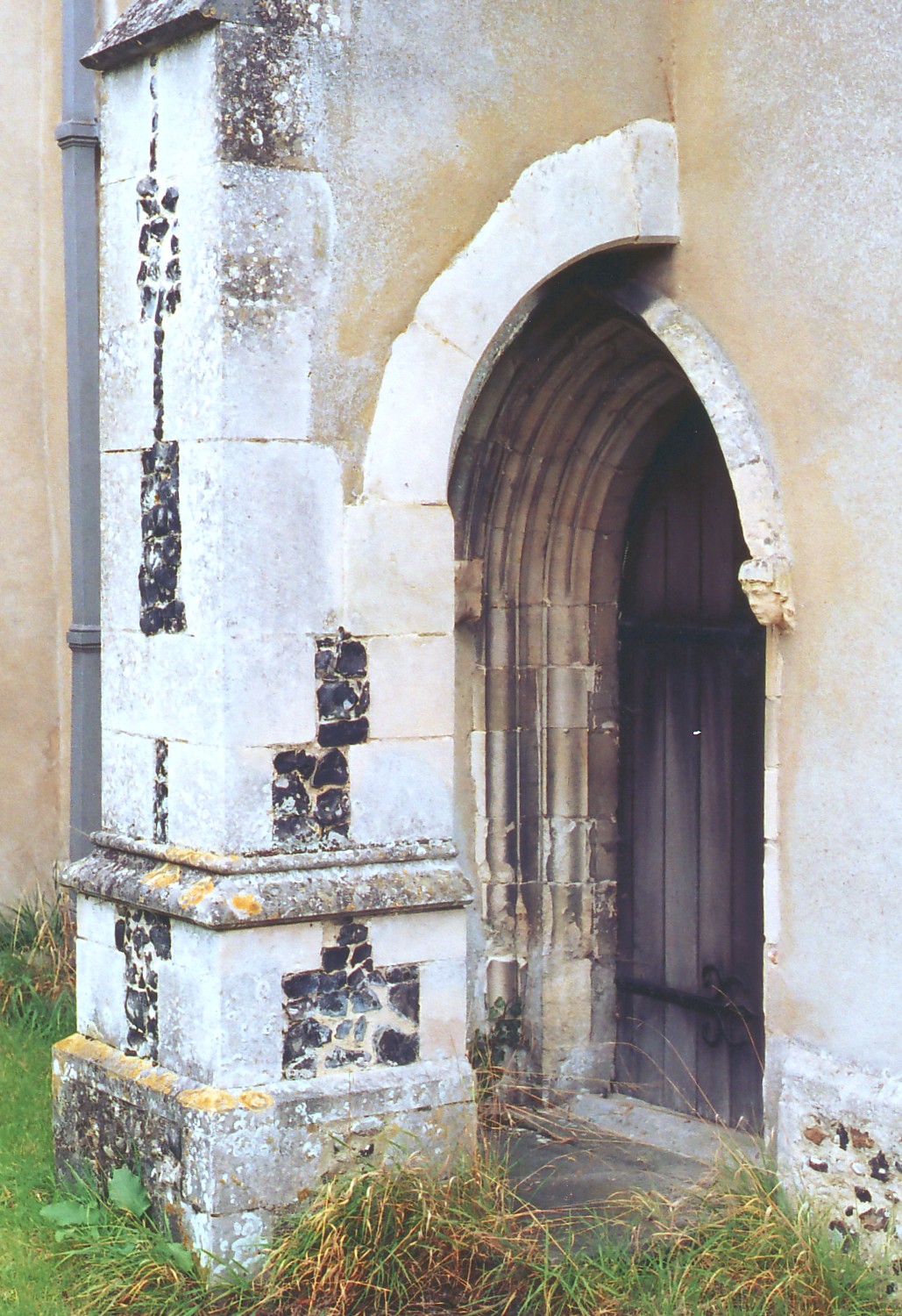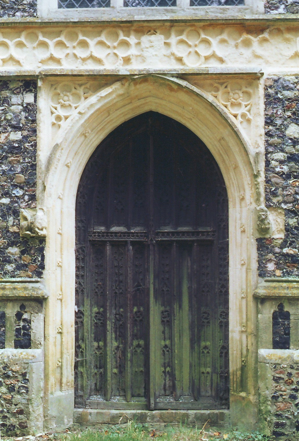 The chancel is two bays long and lit by two, two-light S. windows with supermullioned tracery, little quatrefoils above, and fine head label stops, and between these windows is a priest’s door with a flying buttress over (shown above right), in a strange but picturesque arrangement that is probably not mediaeval (although see also St. Peter & St. Paul's church, Eye). Roy Tricker, writing in the church guide in 1992, considered the reticulated E. window to date from c. 1330, but he also reported that 'the chancel underwent a very thorough restoration in 1886.... to the designs of the Ipswich architect Edward Fernley Bisshopp' and an examination of the stonework here, both outside and in, suggests this window is more likely to be Bisshopp’s work (at least in its present form) than anything earlier. (In fact, the same conclusion is also suggested by the unusual shape of the reticulation units, which have larger foils at top and bottom than they do at the sides, a form uncommon in mediaeval work.) The chancel has no north windows, but what is notable on this side of the church is that although there is no north aisle, the nave has a clerestory both here and to the south, formed of five pairs of large, untraceried, three-light windows with depressed arches, which, to the north, are completely unsynchronized with the three, two-light nave windows below. Of the latter, the two to the east are similar to the S. windows to the chancel, while the window to the west, like its counterpart in the nave S. wall opposite (west of the porch and chapel), has a quatrefoil above the lights. East of the porch on the S. side, the chapel window has supermullioned tracery with split 'Y's and a little quatrefoil in the apex, and the chapel E. window is three-light, with supermullions that give way below the window head to a row of three small quatrefoils. This work appears contemporary with the fifteenth century tower. The porch is cross-gabled and diagonally-buttressed to both the southwest and southeast, notwithstanding the lean-to chapel adjoining to the east. Its outer doorway, set slightly east of centre, carries wave mouldings supported on semi-quatrefoil responds, but the inner doorway is finer, with a series of little waves and hollows and a hood-mould decorated with fleurons that rises from large head label stops. Its very low-pitched roof has castellated wall plates and carved arched braces supporting cambered tie beams.