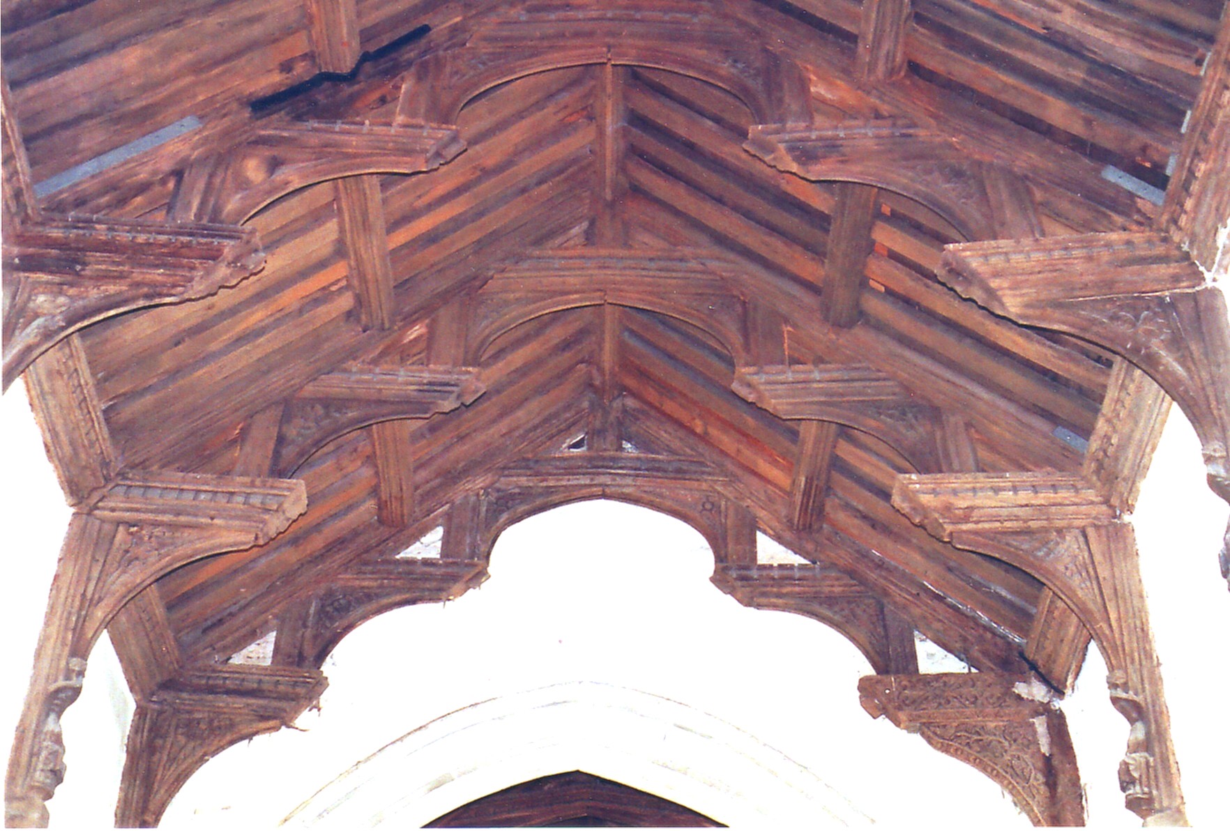 Inside the church, the features that command attention first are probably the chapel and chancel arches, which Tricker implies are fifteenth century work but which look like fourteenth (which would make them earlier than the chapel windows) and which are similar in design if not in scale, being formed of arches of two orders, bearing a hollow chamfer and a wave moulding, separated by a hollow and springing from wide semi-octagonal responds. (See the chapel arch, above right.) Certainly, at the very least, these are not contemporary with the clerestory - which is fifteenth century work - for the chapel arch cuts into the line of the clerestory windows very slightly, which maintains a constant level nonetheless. However, be this as it may, the finest internal feature of the building is the double-hammerbeam nave roof (shown below), constructed in six bays, with carved figures supporting the wall posts and traceried spandrels beneath castellated hammerbeams, now, predictably, without angels. The especially intricate easternmost spandrel and hammerbeam to the south, has been identified by Tricker as a seventeenth century replacement. (Note also that the five pairs of clerestory windows, correspond with the five eastern bays of this roof, leaving the western bay blank.) The chancel roof is only of restoration date but the panelling around the walls of the nave, the gallery above the nave W. end, and the wooden vestry beneath the gallery to the south, all appear to be Georgian. The font is another nice piece of mediaeval work, with an octagonal bowl carried on a stem supported by buttresses alternating with what are probably four lions (although one looks very like a monkey), and with carvings on the faces of the bowl, representing, in clockwise order from the south and omitting the damaged north face, an angel holding a shield, a Sacred Heart set inside a crown of thorns, a Crucifixion scene, an angel holding a heart (northwest), a rose (northeast), another angel holding a shield, and another crowned 'M'.