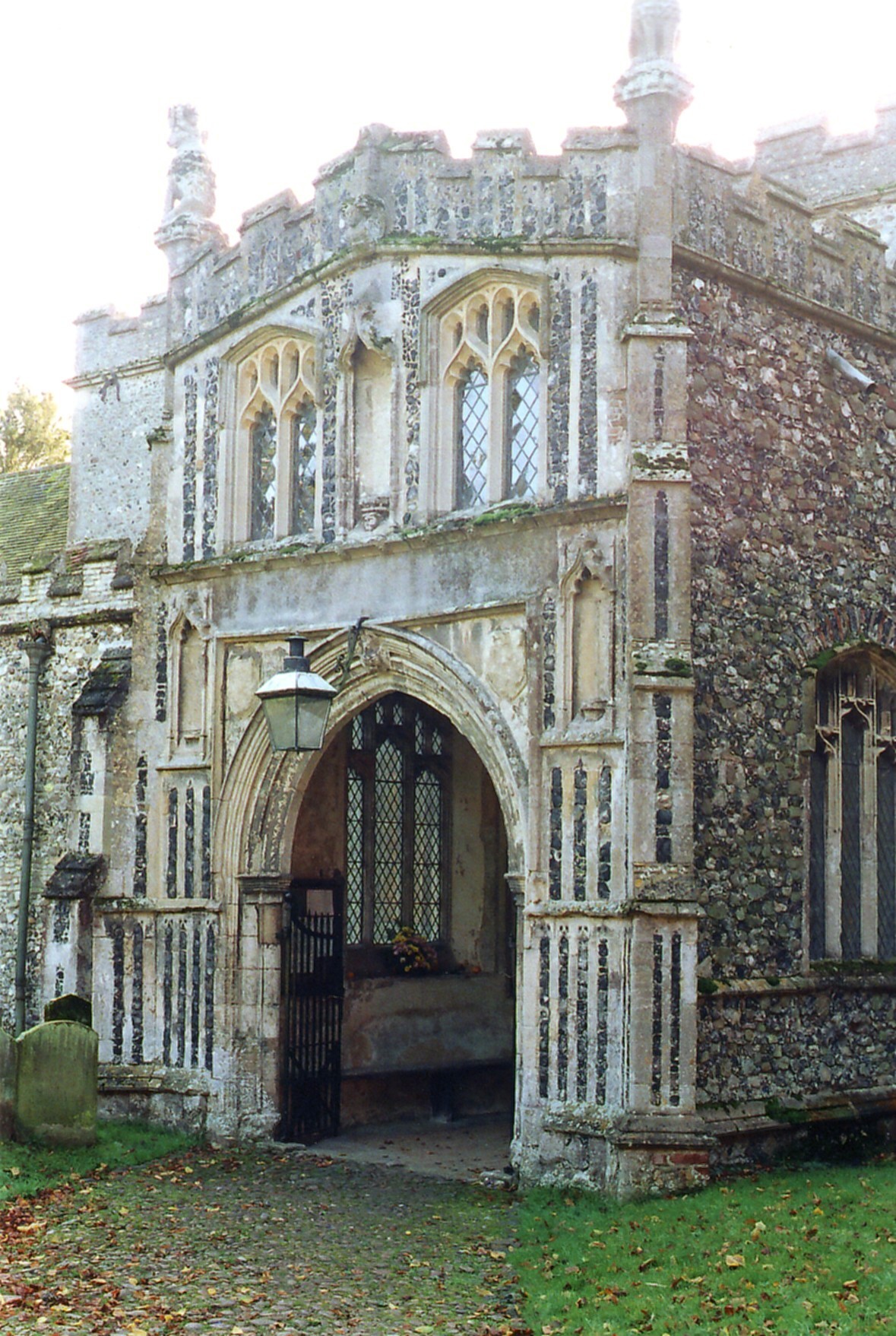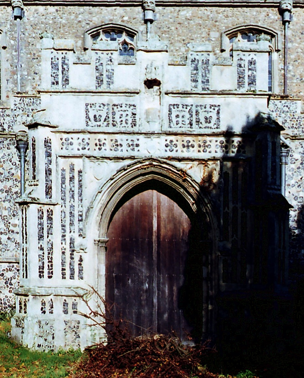 The two-storeyed N. porch (left) is diagonally-buttressed and surmounted by pinnacles at the corners, carved in the form of lions and green men. The two, two-light N. windows to the upper storey have been renewed, but the three-light windows to the east and west below, are original and have stepped lights topped by castellated supertransoms and supermullioned tracery beneath segmental-pointed arches. There are niches to the left and right of the outer doorway and a larger canopied one above, between the two N. windows, and the porch is decorated with flushwork on the battlements, the leading edges of the buttresses, and across the whole of the N. front. The outer doorway has a complex profile that includes among its mouldings a flat chamfer decorated at intervals with carved roses, springing from semi-quatrefoil responds. A stair to the left of the N. door inside the church, leads to the porch upper storey, where there is the 'most complete armoury of any English parish church' (Enid Radcliffe & Nikolaus Pevsner, The Buildings of England: Suffolk, Harmondsworth, Penguin, 1974). For understandable reasons, this is usually kept locked and it was not examined on this visit.