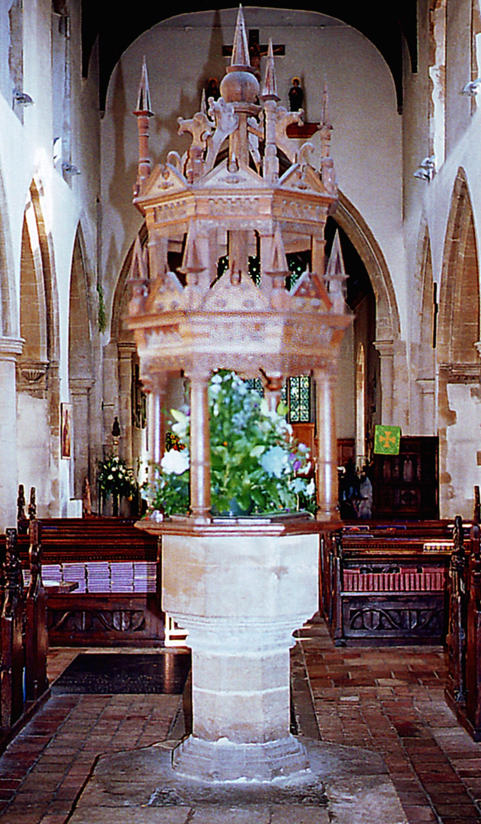 Re-entering the church and turning to the furnishings, the outstanding piece of work is manifestly the font cover (shown left) by John Turner, which is dated 1630. It rises in two slightly diminishing octagonal stages with canopies gabled on all sides, the lower of which is supported on Tuscan columns while the upper tier has obelisks rising from the corners and another in the centre. Turner was reputedly also responsible for the pulpit, but this is a far more conventional piece of work displaying the usual three tiers of panelling, with the expected round arches on the second. The altar rails are believed to date from 1660. The roofs are largely renewed except in the S. aisle and S. porch, which now serves as a chapel. The former, though of simple lean-to construction, is unusual in having a central purlin supported by king-posts rising from tie beams spanning the aisle between the wall plate on one side, and the arcade spandrels on the other.