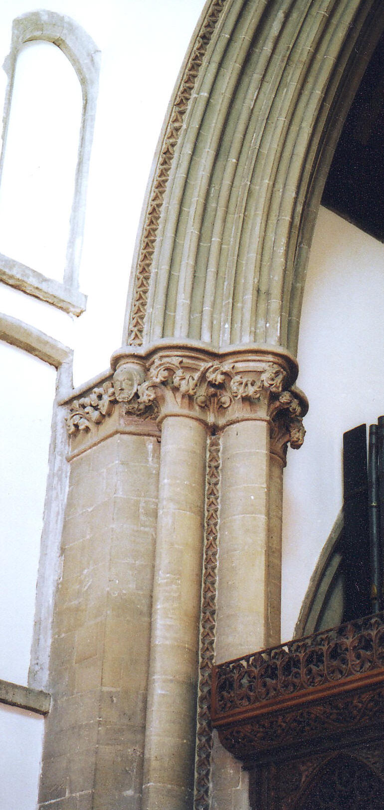 To consider, in turn, the contribution of these two general phases of construction to the building as it exists today therefore, the very large mediaeval vestry retains three original lancets in its east wall (the central one slightly taller and wider than the outer two) and two in its north wall. The date of the chancel is best shown internally by the chancel arch (the north side of which is shown below left), which carries dog-tooth moulding and a series of characteristic thirteenth century rolls above responds composed of clusters of keeled shafts with a line of dog-tooth between and stiff leaf capitals. The two, three-light, N. windows to the chancel, east of the vestry, and the second and fourth S. windows from the west, are formed of stepped, trefoil-cusped lights in encompassing arches, with skewed daggers squeezed in above lights 1 & 3: they are no earlier than c. 1300 and may either have been inserted in the chancel some years after it was first built or else represent a change of design during the course of the chancel’s slow construction. In either event, it seems unlikely they are exactly contemporary with the first and third S. windows from the west, which have intersecting tracery, not only because this was a perfectly usual later thirteenth century form but also due to the fact that, unlike the other four windows, these lack the internal side shafts, which would be a strange omission if they were constructed simultaneously by the same master mason. Nevertheless, be that as it may, by far the most notable window in the chancel and, indeed, in the entire building, is the huge window in the east wall (shown below right), which also has an order of internal shafts. Comprising seven lights of varying widths, with a band of quatrefoils running round the arch above, to join lights 1 and 7, this also features large irregular cusped triangles with bowed sides, looking like Christmas trees, sitting inside subarcuations above lights 2/3 and 5/6, and a large irregular octfoil inside an oval, filling the central space between, which is itself surrounded by a border of little cinquefoils. It is a unique, extremely rich and ingenious, yet simultaneously less than full competent design, for it must be admitted that the 'Christmas trees' do look a little odd, and that some of the cinquefoils in the border round the oval, look extremely uncomfortable for having been squeezed, as they are, into their unsuitable allotted spaces.