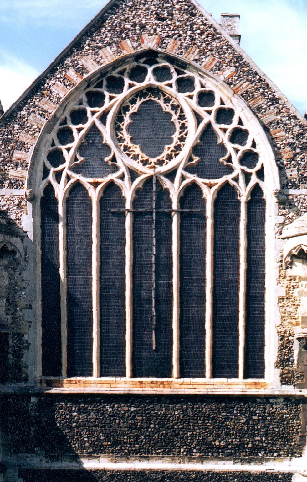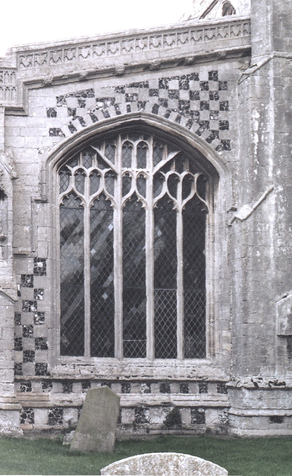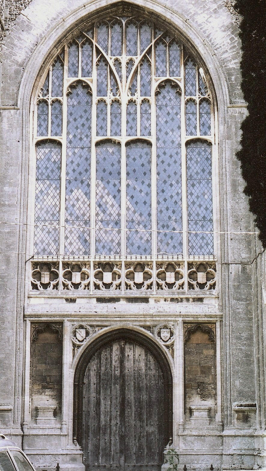 The S. aisle S. windows (four to the east of the porch and one to the west) are segmental-pointed and four-light, with supermullioned tracery and quatrefoils in the heads. The bays are separated by buttresses rising to crocketed pinnacles. The S. aisle E. window is supermullioned but five-light, with the central light lower than the outer four (sic). The restored S. porch has two, two-light windows on each side, now with a form of reticulated tracery; the very tall outer doorway has a hollow chamfer running round it, decorated with carved rosettes at intervals and, at the bottom on each side, a little pig that seems to be original. The four-light N. aisle N. windows are supermullioned but different to their southern counterparts, with quatrefoils in the heads above split 'Y's and further quatrefoils beneath the subarcuations over lights 1/2 and 3/4. On this side of the church - which is the principal show side - the buttresses are provided with niches for statuettes and two tiers of narrow blank arcading cover the battlements. The same decoration continues round the massive N. porch (shown below left, from the northwest), which is claimed to be, surely with justification, one of the largest in Suffolk. The five-light N. aisle W. window (below right) has strong mullions either side of a central light with two tiers of reticulation units separated by a castellated supertransom, while the outer pairs are subarcuated. The two-light windows to the N. porch lower storey are simpler versions of the N. aisle windows, the upper storey windows are two-light, untraceried and square-headed, and the N. window (above the outer doorway) has drop tracery beneath a very flat segmental arch. Inside the porch, the lower storey has a tierceron vault rising from semicircular shafts at the angles and wall midpoints. The inner doorway has traceried spandrels beneath a label, and there is blank arcading above and to either side, as well as more blank tracery on the wooden door itself, which seems largely original. The porch upper storey opens internally to the N. aisle, above a balcony, through two uncusped, four-centred arches.