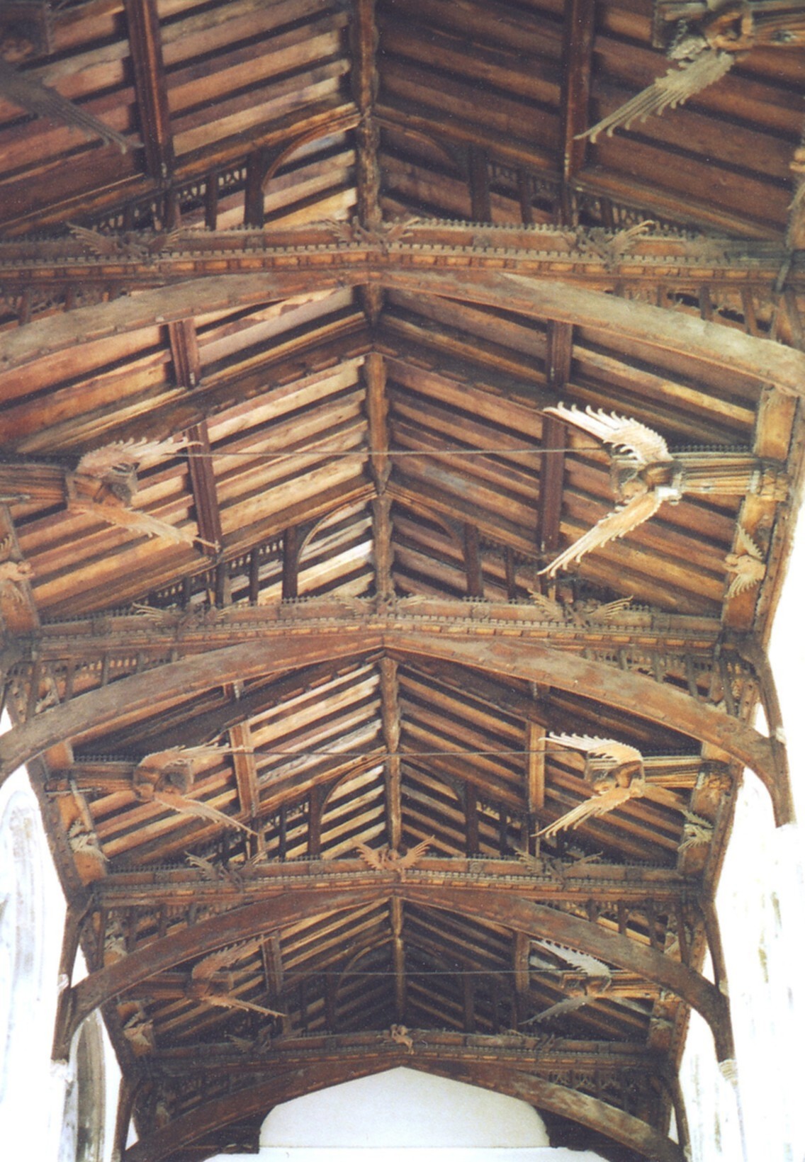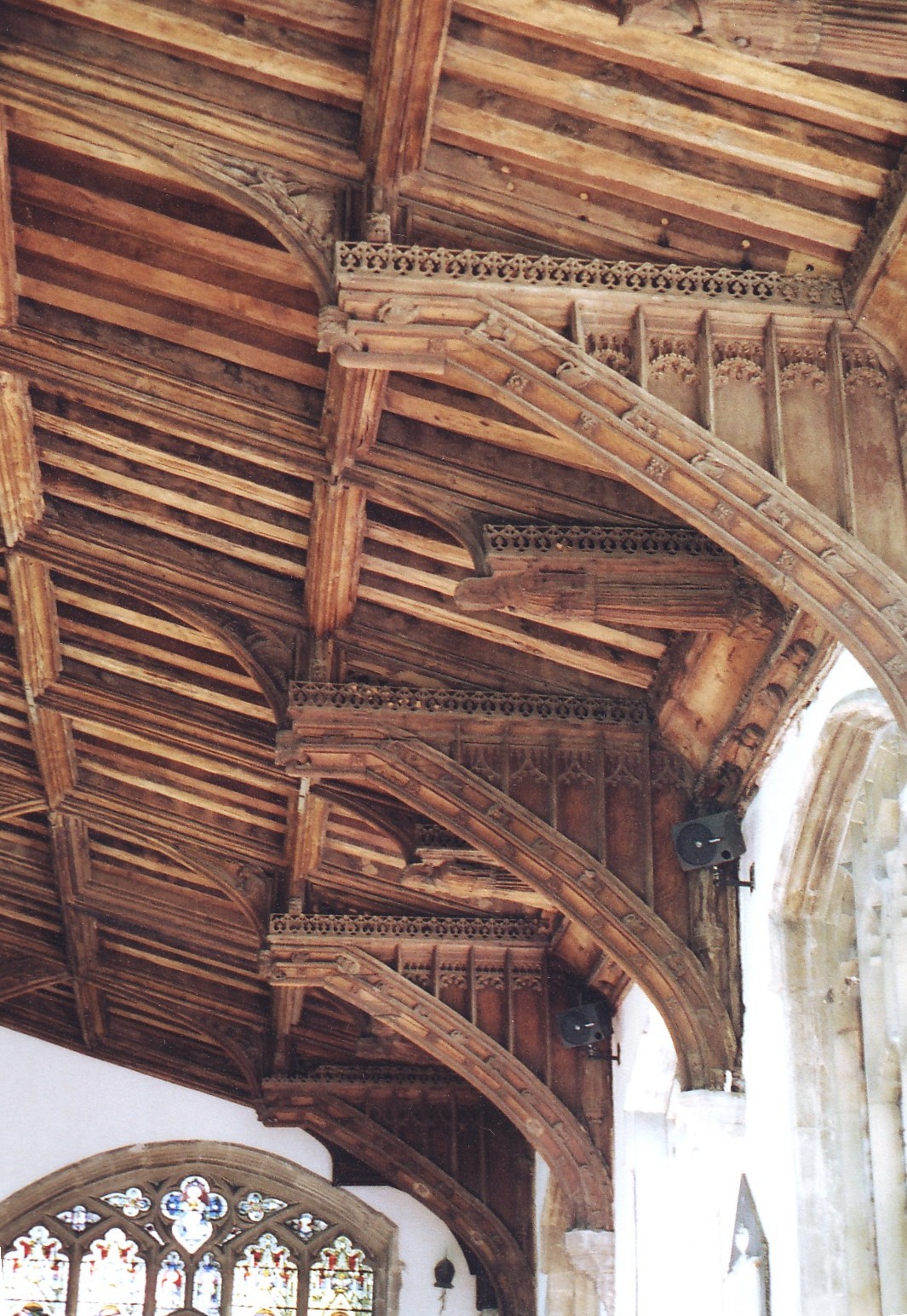 Inside the nave, the aisle arcades consist of just five bays, formed of arches bearing a complex series of shallow mouldings springing from lozenge-shaped piers with flattened, semi-octagonal shafts towards the openings only, and, to north and south, much narrower semi-octagonal shafts without capitals that rise up between the arches to support corbels on which the wall posts of the nave roof appear to rest. The three-light clerestory windows have central lights lower than the outer two, supermullioned tracery, and little quatrefoils above. The low-pitched nave roof (shown below left) is formed, in effect, of five complete bays and a half bay at either end, separated by tie beams, each of which support four pairs of little crown posts, and which are supported in their turn by arched braces with traceried spandrels below. Carved angels decorate the wall plates, tie beams, and false hammer beams between the tie beams (or, more accurately, these are themselves carved into the form of angels, as distinct from having angels figures attached to them). The majority of this is still mediaeval, although an 'examination of the roof in 1930 showed that… much of the woodwork was riddled with small shot [and] there were even… two arrow heads in the bodies of angels' (notes in the church). As for the aisle roofs, these 'have been called the most elaborate aisle roofs in England. Both are lean-to roofs and the massive hammer beams used are clearly there for decorative purposes only, being far heavier than would be required for structural reasons alone. [See the N. aisle roof, below right, viewed from the east.] There is a wealth of carving here still but much was lost in Puritan times.' Even so, the N. aisle still retains a series of carvings in the spandrels depicting twelve scenes that include demons playing an organ, St. George and the Dragon, and the baptism of Christ, while carvings with similar subjects can be seen on the S. aisle roof. 'No less than 164 carvings of swans and antelopes, the emblems of King Henry V, have been counted in the mouldings of this roof' (ibid), which hence appears to witness its date.