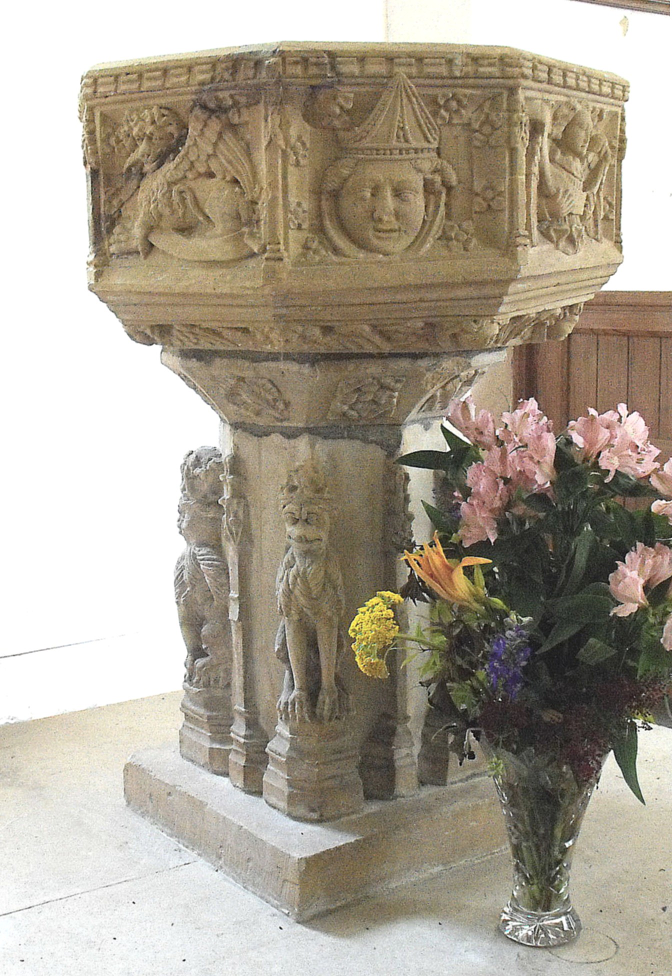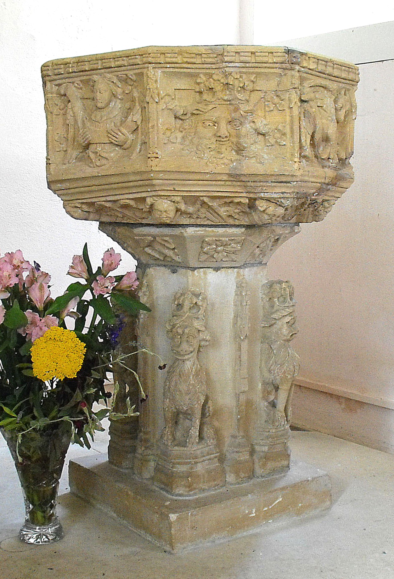 The font is particularly interesting. The elaborately carved octagonal bowl features the symbols of the Evangelists alternating with images of a king, a bishop, and a couple of green men, one of whom is sticking out his tongue. The stem is supported by four crowned lions separated by buttresses terminating in crocketed pinnacles. (See the photographs below, showing the font from the southeast on the left and from the southwest on the right.)