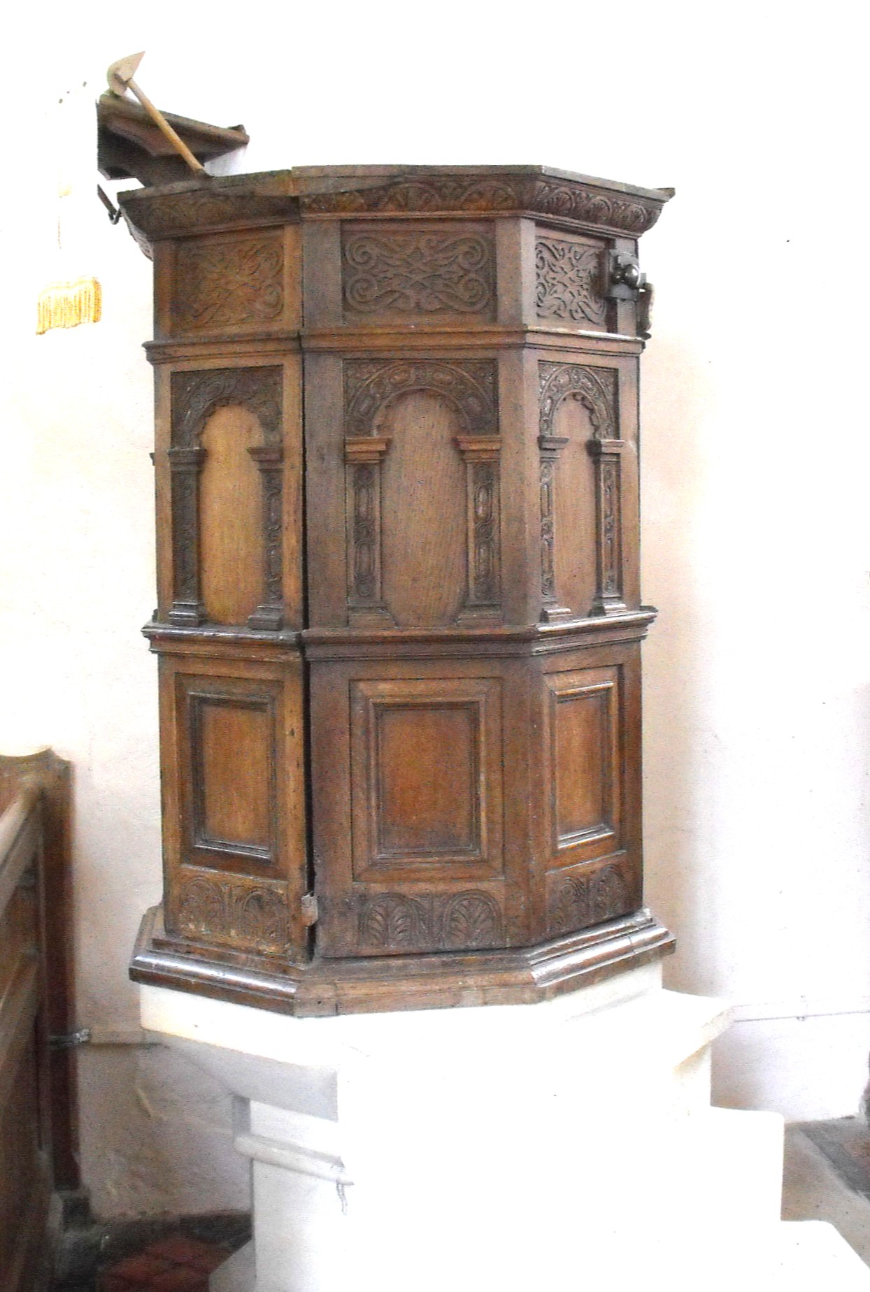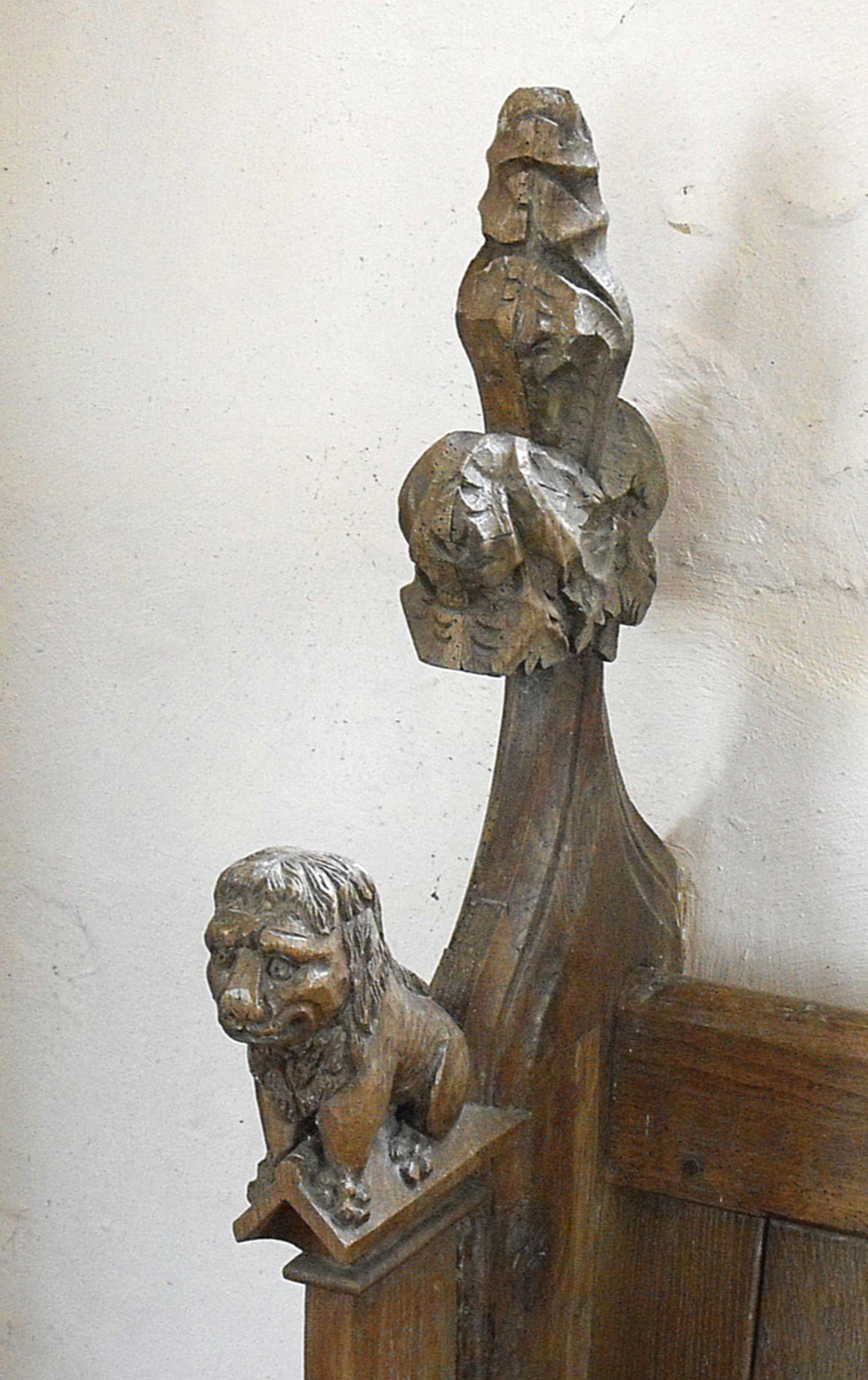 The church interior is light and spacious due to the equal width of the nave and chancel and the absence of either a chancel arch or screen. The relative positions of the nave and chancel are demarcated by a former rood stair, however, whose entrance may be seen in the S. wall of the nave, though all signs of the exit have now disappeared. Wooden furnishings include the Jacobean octagonal pulpit, now standing on a modern base (shown above right), with a low tier of sunk panels, the usual blank arches around the second stage, and applied fretwork on the short upper stage; the cornice is scalloped. The chancel retains some mediaeval benches with poppyheads and carved 'arm rests' featuring figures and animals (including the anthropomorphic lion shown below left). An incompetently designed Royal Arms of George IV hangs on the nave N. wall, above the pulpit (as illustrated below right), and the remains of a monument on the sanctuary N. wall features busts of Sir Samuel Sayer (d. 1625) and Thomasine his wife (d. 1647), who hold hands above a skull. The nave and chancel roof is ceiled but the tie beams can still be seen.