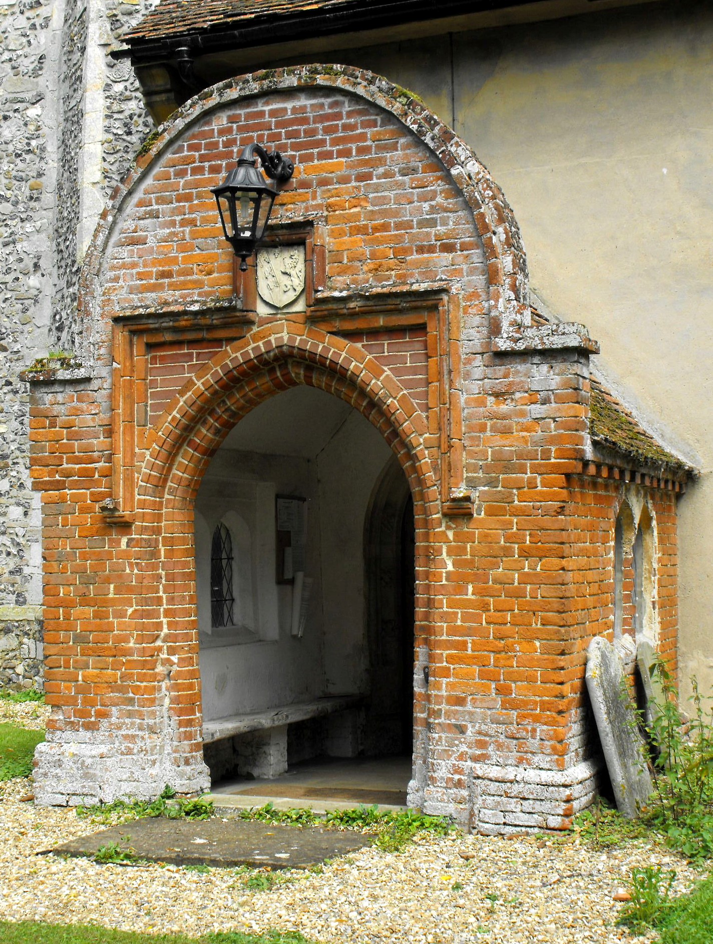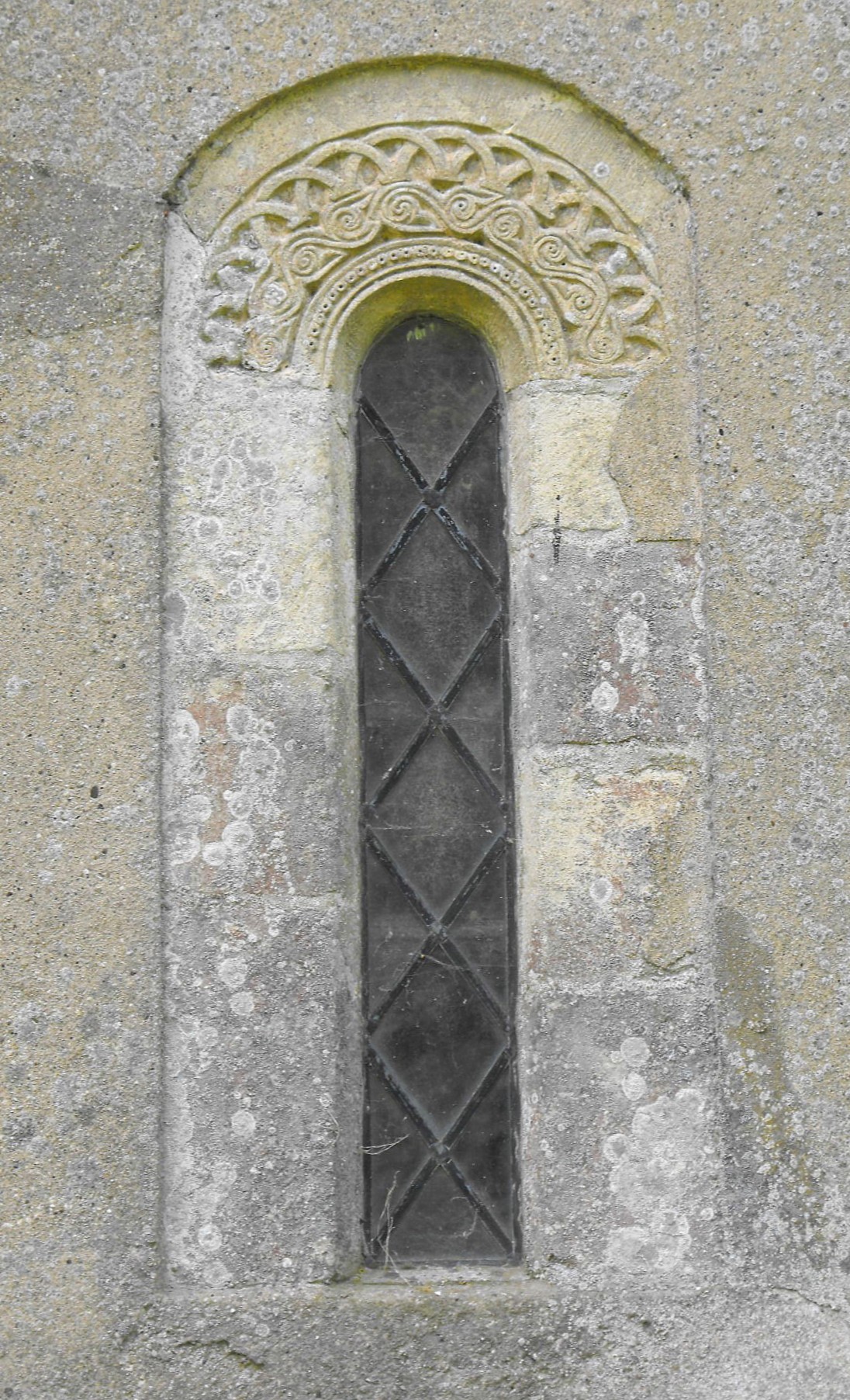 This small church, formed of a chancel, a nave with a S. porch, and a W. tower, is notable for a number of disparate features rather than the architecture of the building itself, although the latter must probably be considered to include the little beautifully preserved, round-headed Norman window (seen above right) in the N. wall of the nave, with delicate carved decoration around the head formed of an inner band of beads, a second of scrollwork, and a third of intersecting semicircles. This must surely have spent most of the last nine centuries covered up to have survived in so crisp a condition. The nave and chancel are built without structural division and are rendered externally like the nave and chancel at nearby St. Mary's, Naughton. Most of the windows are two-light, with supermullioned tracery beneath segmental-pointed arches, but there is also a similar one-light window in the nave N. wall towards the west, a two-light window with a straightened reticulation unit in the head in the chancel S. wall, likewise towards the west, and the chancel E. window with attractive but entirely renewed 'Decorated' tracery. The tower seems to have undergone a complete reconstruction. (D.P. Mortlock says the church sustained serious bomb damage in 1940 (The Guide to Suffolk Churches, Cambridge, The Lutterworth Press, 2009, pp. 356-357)). It rises in three unbuttressed stages to cinquefoil-cusped Y-traceried bell-openings and stepped battlements, with a prominent semi-polygonal projection for the stair ascending the first stage at the east end of the S. wall. More important than this, however, the S. porch looks original and is an attractive little structure with a semicircular gable, constructed in English-bonded Tudor brick (seen below left, from the southeast), featuring an outer doorway carrying two sunk quadrants in moulded brick, set inside a label that steps up in the centre over a shield bearing a lion rampant. The Perpendicular inner doorway has a casement moulding running around it, decorated at intervals with carved leaf and flower motifs.