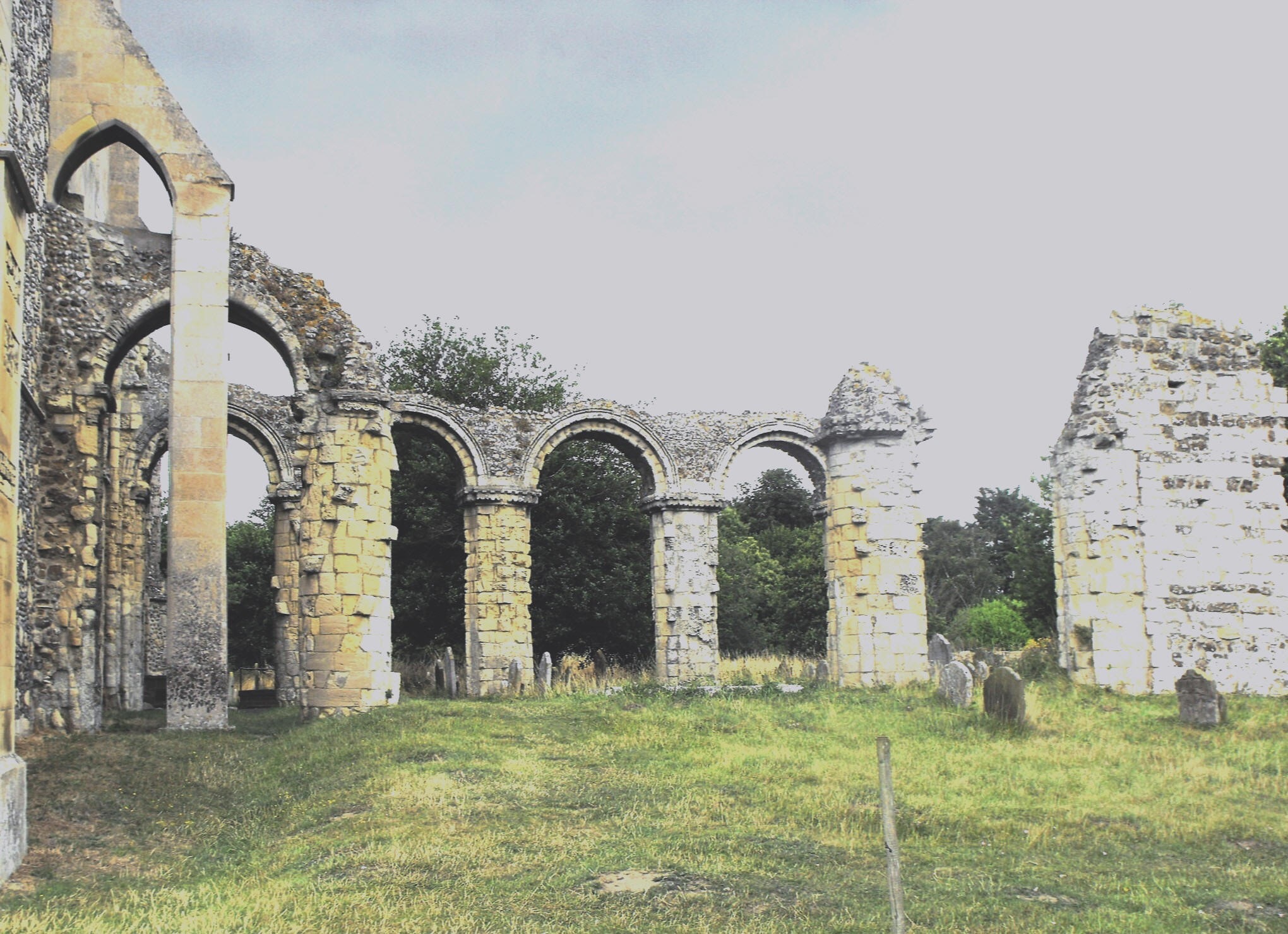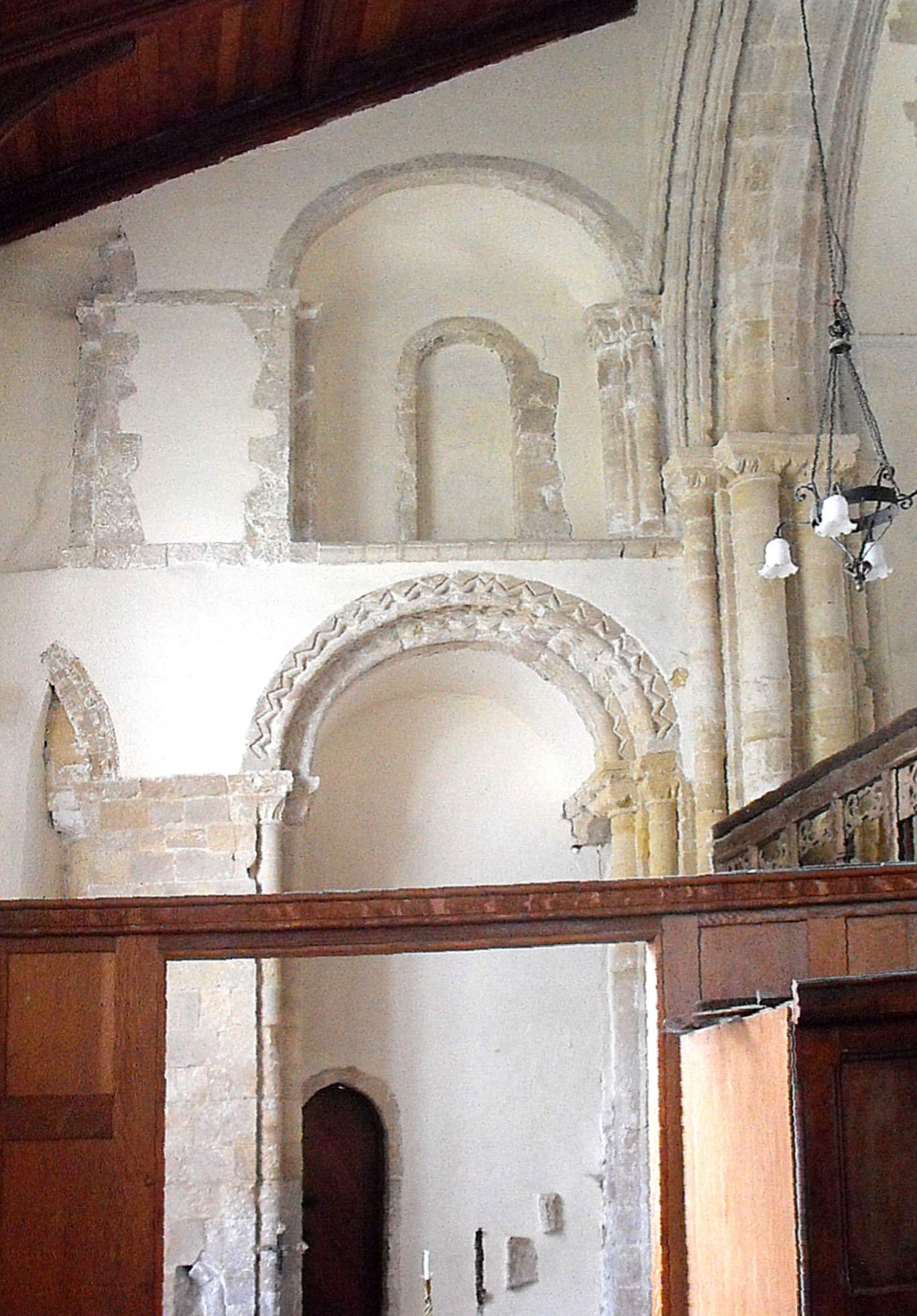 Some description of these Norman remains is necessary. Four round arches survive to the north of the former chancel and just one to the south, all now exposed to the elements. The circular piers retain evidence of decoration which include fragments of a protruding spiral pattern around two of them and the remains of vertical shafts attached to the others. The large, square capitals are all scalloped, and the arches bear grooves and the eroded remnants of chevron. The arches that once led from the N. transept to its E. aisle (probably constituting one or more chapels) appear to have differed, the arch towards the south being formed of two orders bearing rolls and chevron above tall circular shafts with scalloped capitals, and the arch towards the north, of which only a fragment remains, perhaps formed of a single order decorated with billet. (See the photograph above right.) The eastern crossing piers had pairs of attached circular shafts with scalloped capitals facing west and, perhaps, pairs of slightly narrower attached shafts facing north and south. (Only one now remains on each side.) The transept aisles carried a triforium above, of which one and a bit of the arches facing the former N. transept remain, replete with two orders of side-shafts. The blocked arch leading to the triforium passage above the chancel aisle, is visible within the southern triforium arch.