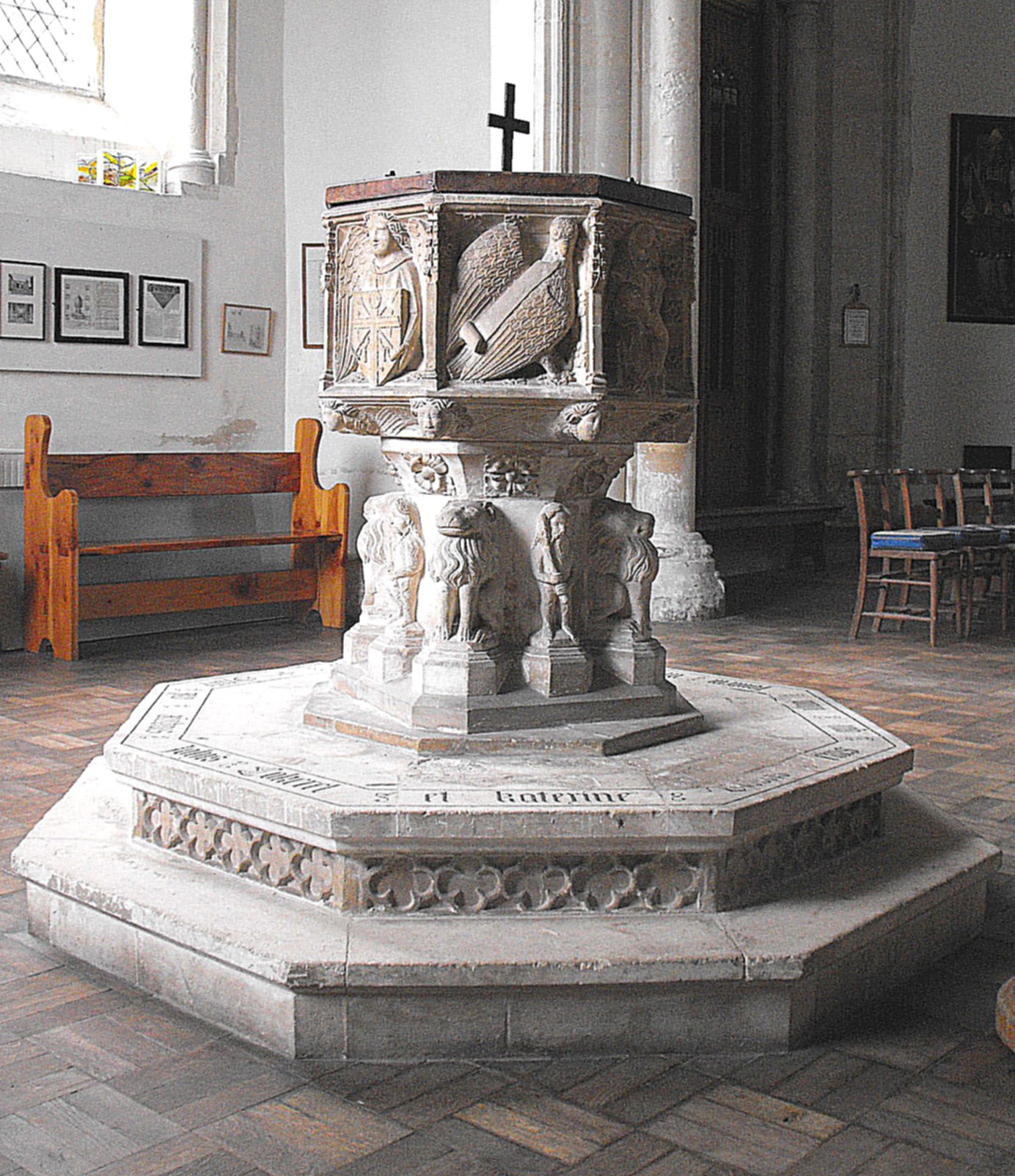 Except for a wealth of brasses, not usually covered in these notes, this left the building largely devoid of worthwhile furnishings, but the font (shown below right) is of some interest, even though it looks suspiciously as though it may have been retooled: the eight faces of the bowl feature the emblems of the Evangelists alternating with the Pietà, the Instruments of the Passion, and Emblems of the Trinity (two faces), while supporting it around the stem, lions alternate with woodwoses.