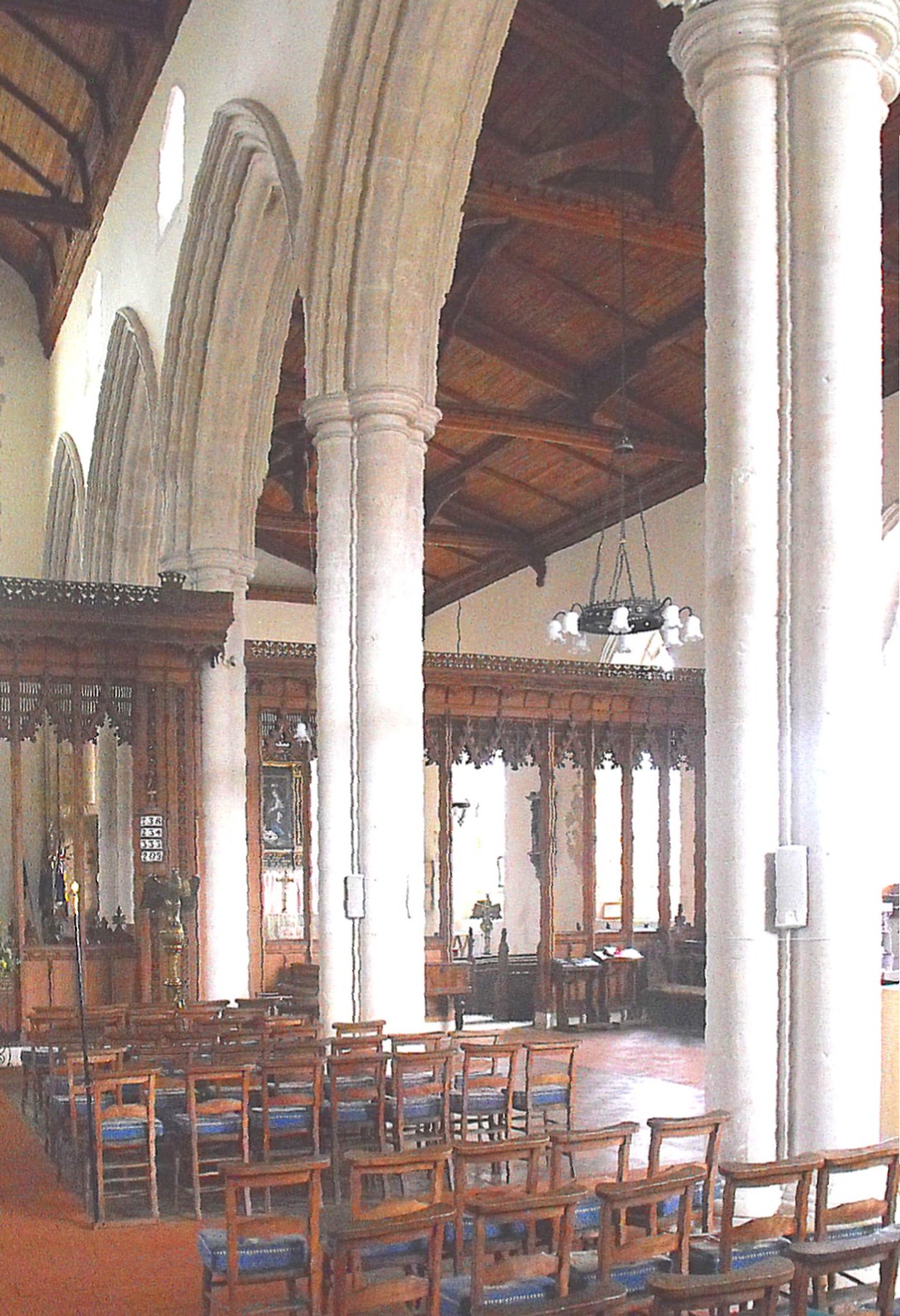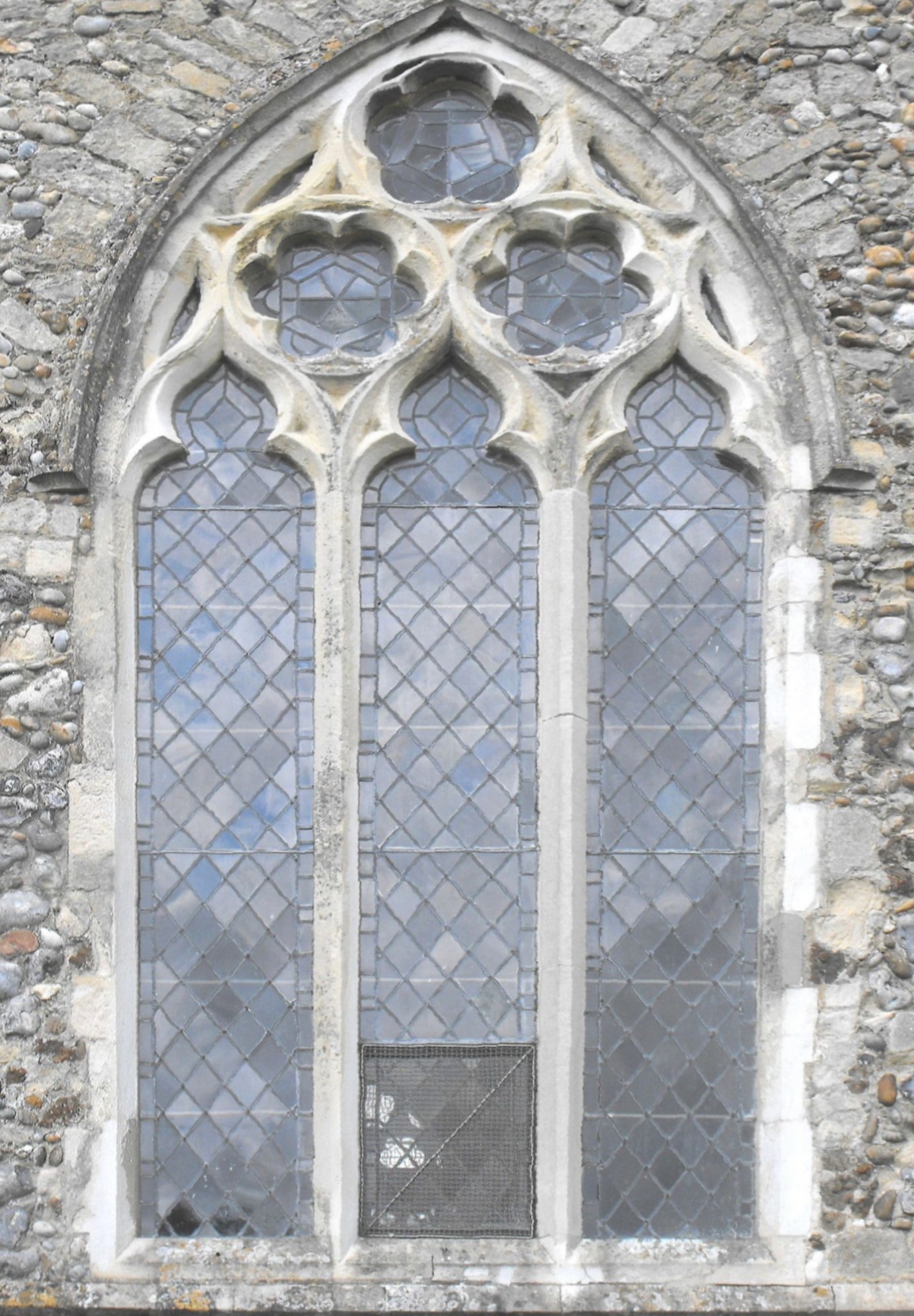 The reconstruction of the western part of the church (seen above left, from the southwest) appears to have taken place c.1320-30 and to have involved the demolition of the Norman nave, crossing and transepts, and their replacement with a tall aisled nave, five bays in length, and a massive W. tower. The majority of this work remains essentially as built, but the bell-stage of the tower collapsed in May 1830 (ibid., p. 16), and the blind upper stage that eventually replaced it, is, considering the date, an exceptionally maladroit addition of 1972 (The Buildings of England: Suffolk East, p. 447). The aisle arcades are composed of arches of complex profile, springing from piers of quatrefoil section with small square spurs in the diagonals. (See the S. arcade, illustrated above right.) Birkin Haward considered that the exceptional width of the S. aisle (it is half as wide again as the N. aisle and slightly wider even than the nave) reflected the projection of the original S. transept (Suffolk Medieval Church Arcades, Hitcham, The Suffolk Institute of Archaeology and History, 1993, p. 320). The windows to both aisles, with the exception of the four-light renewed window in the S. aisle to the west, are three-light and display the alternation of reticulated tracery of the usual pattern with a non-standard design featuring two encircled sexfoils and an encircled cinquefoil in the head. (See the example, below left.) The mediaeval section of the tower comprises the three lower stages, with massive diagonal buttresses, a W. doorway of complex profile above two orders of shafts, and a three-light W. window with renewed curvilinear tracery, separated from the doorway beneath by a short frieze of blank octfoils with a trefoil-cusped niche in the centre. Inside the building, the tower arch to the nave consists of four orders, the innermost of which springs from semicircular shafts. The S. porch is Perpendicular and has an outer doorway surrounded by a casement moulding decorated with shields at intervals, and more shields in the spandrels. The present E. wall of the church, cutting off the former chancel, was probably erected in the late seventeenth or early eighteenth century, when the nave divided by a screen, separating three bays from two, to provide both a nave and a chancel of itself. The rood screen in position today was erected in 1919 (The Wallace Connection, p. 118). The very high E. window of the church dates from the heavy-handed restoration of the building by John Thomas Micklethwaite (1843-1906) in the late 1890s.