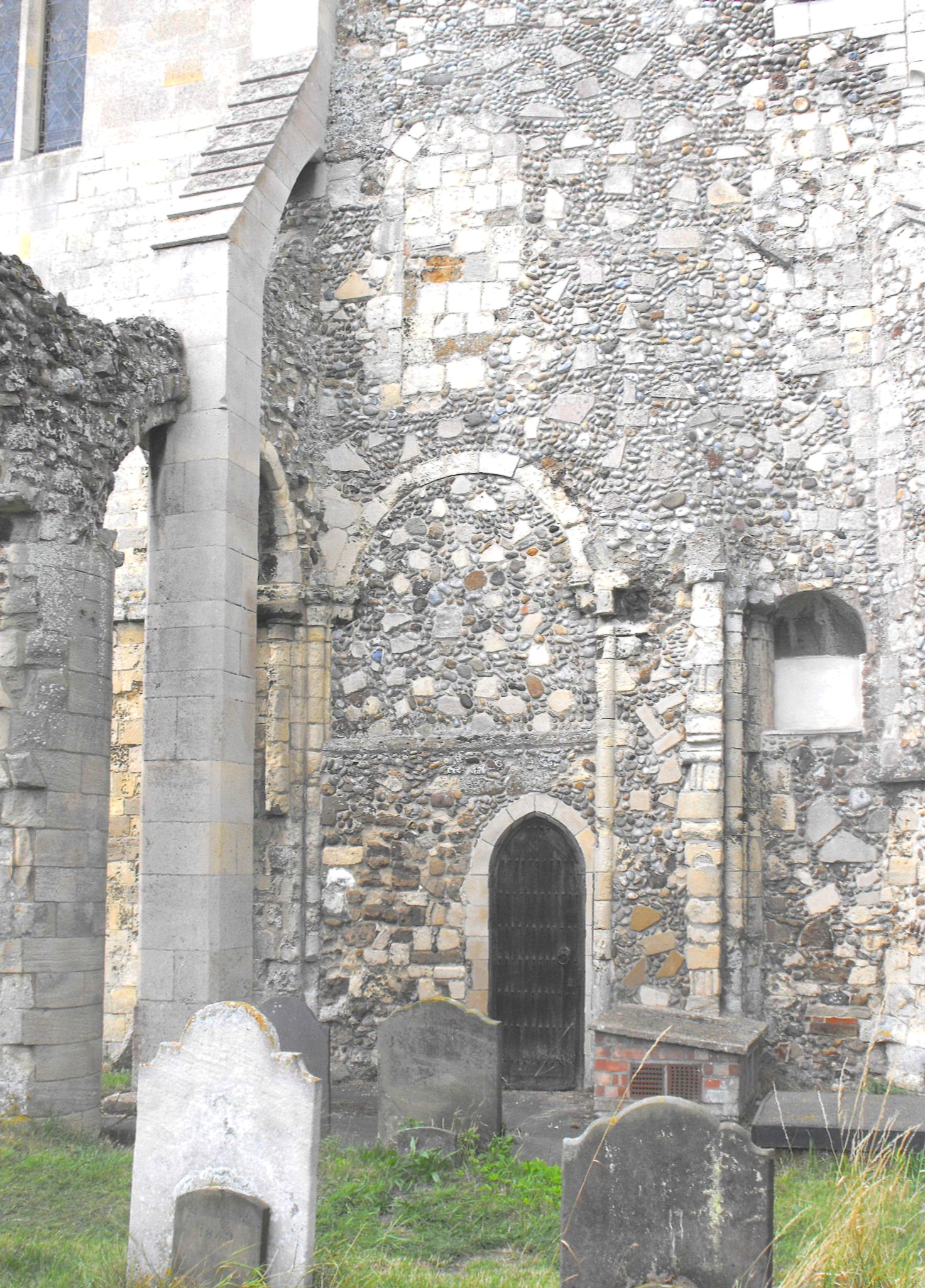Pevsner wrote of St. Bartholomew's, Orford, 'The church consists of two parts, today of little connection with one another: the ruinous late Norman chancel, which was abandoned at the beginning of the C18, and the Dec. nave, aisles and W. tower' (The Buildings of England: Suffolk East, New Haven & London, Yale University Press, 2015, p. 446), and that is the best way to approach and understand this building. The twelfth century church was contemporary with the castle and a highly ambitious structure to boot, judging from the remains of the chancel (photographed above, from the south). Six bays in length and probably originally covered by a stone vault (Sir Alfred Clapham, English Romanesque Architecture After the Conquest, Oxford, Oxford University Press, 1934, p. 93), it had aisles ending one bay short of the square-ended presbytery and turning at right angles in their westernmost bay, to form E. aisles to the transepts. The transepts themselves were demolished together with the crossing in the early fourteenth century to make way for the new nave. However, the chancel appears to have continued in use until at least 1621 (Jane Allen, The Wallace Connection, Orford, Orford Museum, 2008, p. 14)), even though the surviving evidence of the 'join' between the twelfth and fourteenth century parts of the building is now largely confined to the eastern piers of the erstwhile crossing tower, visible only within, and one and a bit of the blocked aisle and triforium arches between the former N. transept and its E. aisle, seen within and without. (The photographs below show these arches from outside and inside, respectively. The pier that once supported the northeast angle of the crossing is seen on the right hand side of the second photograph.) All traces of the original building, west of the E. wall of the crossing, have disappeared above ground, though the situation would doubtless be very different on excavation.