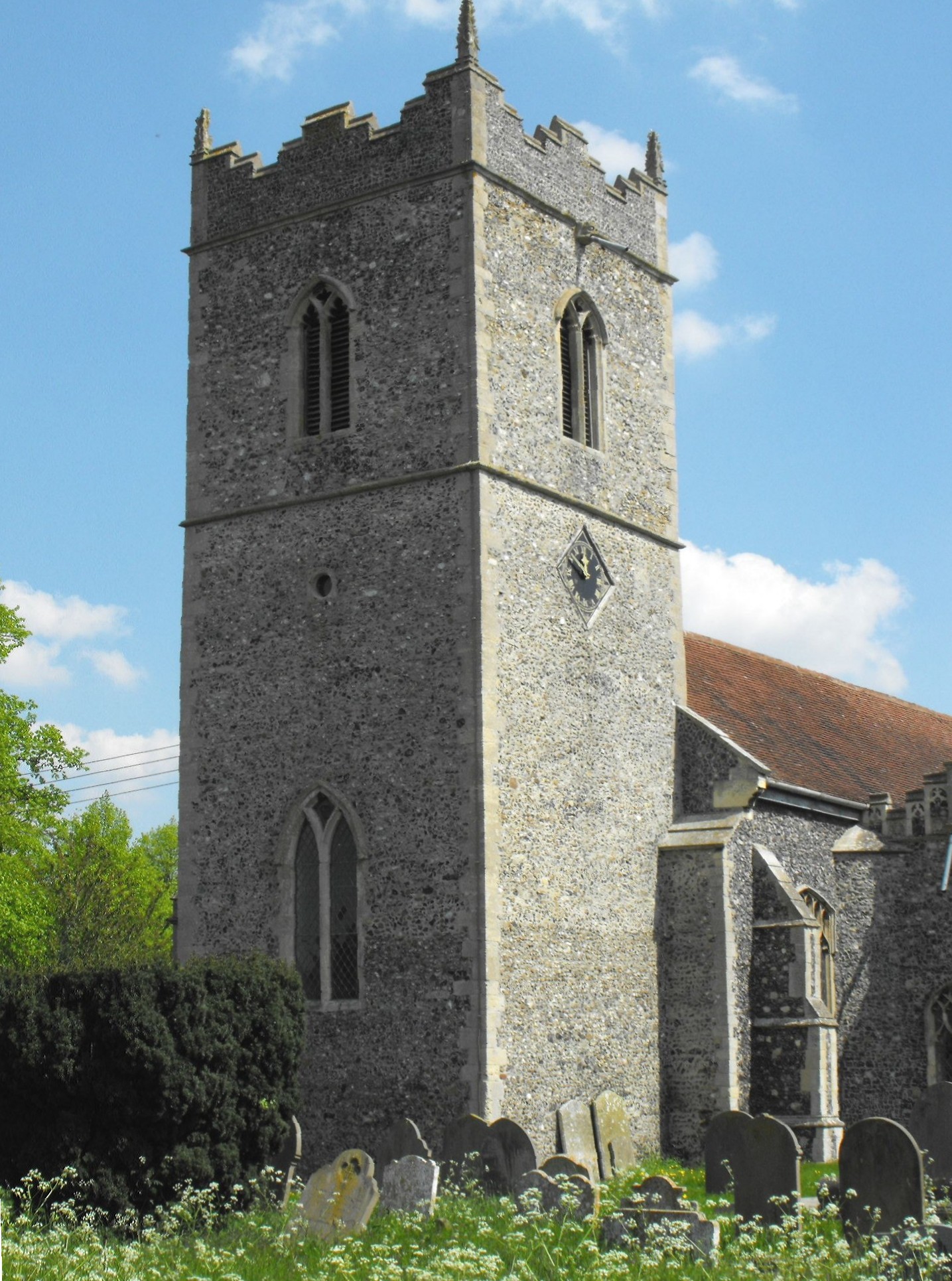 This little church consists of a chancel, a nave with a N. aisle and N. & S. porches, and a W. tower. Apart from the Norman font inside the building, the tower is the oldest feature, perhaps dating from the closing years of the thirteenth century. However, the Perpendicular S. porch is best, and the short chancel is also interesting for it appears to be an example of early Georgian Gothick work, inscribed 'E.B. 1726' on the window jamb outside to the right (north), which Pevsner obviously had not noticed when he wrote in the original Suffolk volume of The Buildings of England, 'probably early nineteenth century', although he did also record a footnote saying that 'Tom Martin the antiquarian [d. 1770] mentions a new chancel in 1729'.