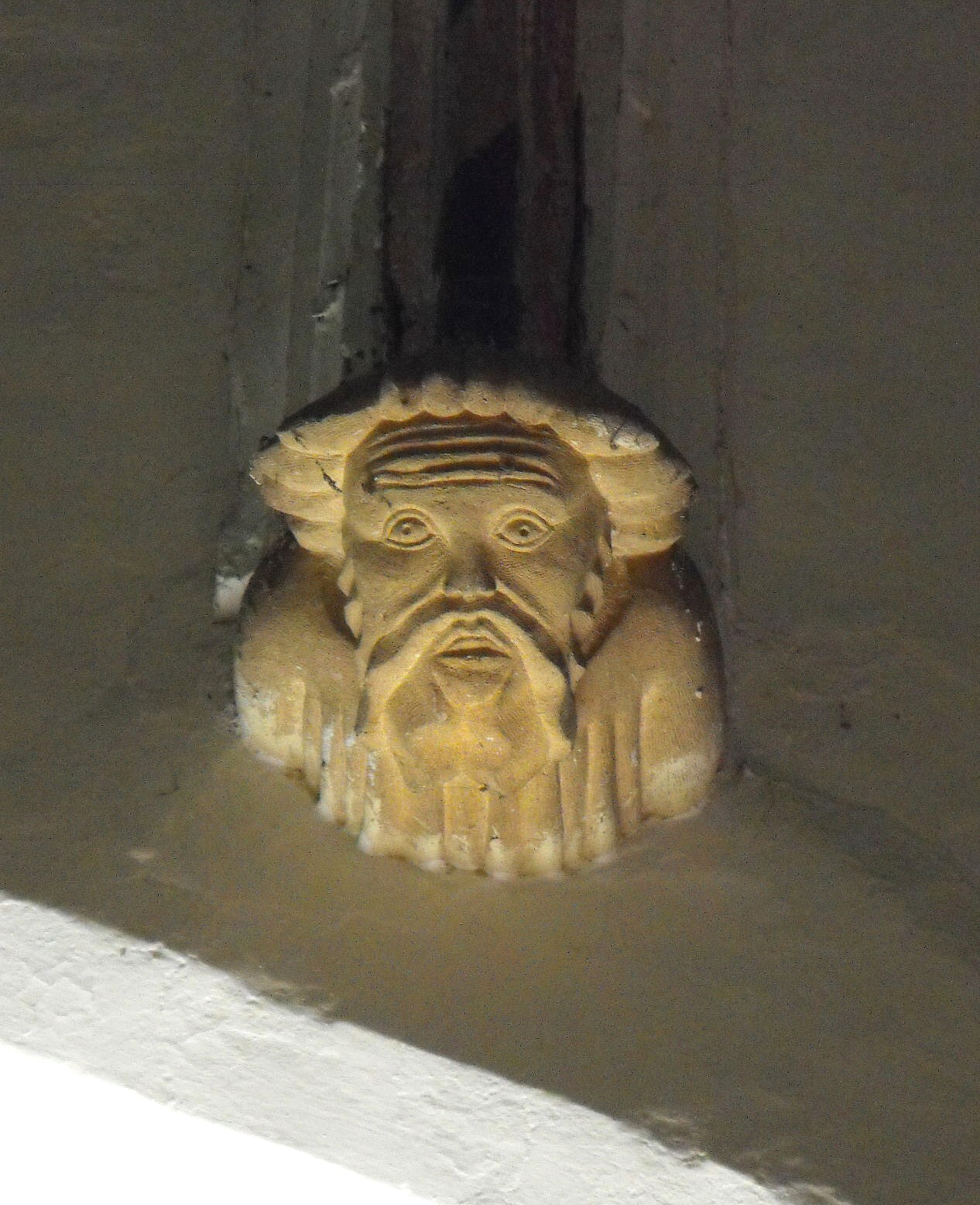 Inside the church, the attractive nave roof is one of two features of especial note, being of single hammerbeam construction, albeit with arched braces that rest directly on the hammerbeams without intervening hammerposts. It retains its stencilling in black on the common and principal rafters, central purlins, and castellated wall plates. The wall posts rest on stone figure corbels which appear to have given one or more mediaeval craftsmen scope to indulge their fancy with a selection of rustic village characters, some of sage appearance and some rather less so. (See the two examples illustrated above.) The Victorian N. arcade is five bays long and composed of arches carrying two wide hollow chamfers supported on quatrefoil piers - a design, however, which seems to have come from the chancel arch, which is mediaeval and of similar form, with a hollow chamfer beneath the soffit as well as at the angle, and broaches leading into the chamfers from the capitals. Pevsner ascribed this to "c. 1300" but a little later might serve better (James Bettley and Nikolaus Pevsner, The Buildings of England: West Suffolk, New Haven & London, Yale University Press, 2015, p. 454). (See, for example, Birkin Haward's dating of many of the county's quatrefoil arcades in Suffolk Mediaeval Church Arcades, Hitcham, Suffolk Institute of Archaeology and History", 1993.) The tower arch consists of two flat-chamfered orders which die into the jambs.