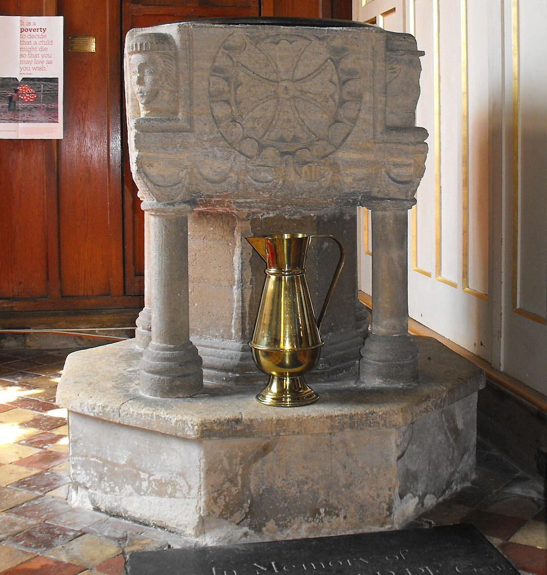 Finally, that leaves just the second important internal feature to describe, in the form of the late twelfth century font (below), which is square and supported at the corners on round shafts with scalloped capitals. Figures at the chamfered angles are particularly well-carved (especially for the presumed date) but the sides of the bowl are filled with more provincial crosses in wheels.