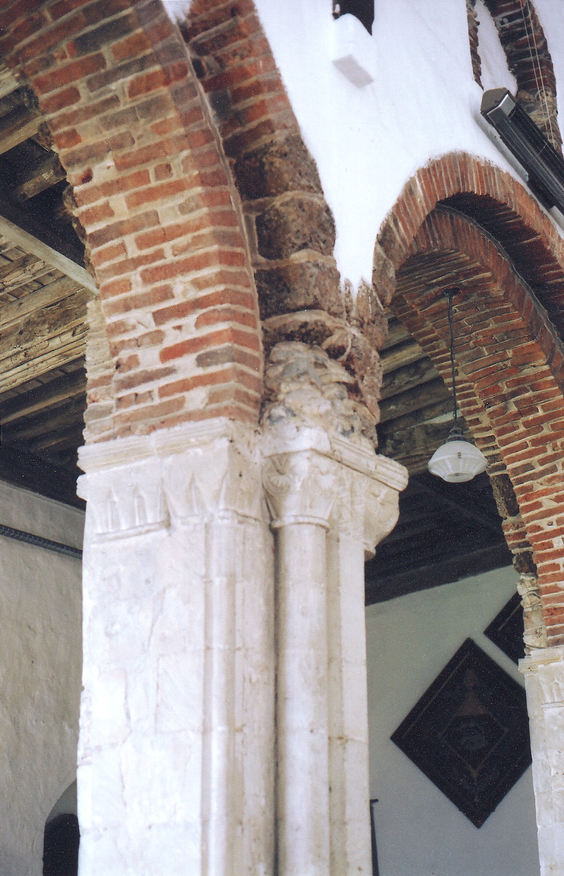 This Norman work must be described in detail. The western bay of each arcade is separated from the others by a wall piece that must represent a decision to extend the church westwards at the time the aisles were added (to an apparently somewhat earlier, aisleless building). The S. arch of this bay has since been rebuilt in stone and given pointed form, but the N. arch is original and formed of two unmoulded orders in brick, which extends all the way round the arch and down the jambs, with only narrow intervening stone abaci that reach far back into the wall, presumably in order to try to spread the load from the arch above, away from the brick responds beneath. The remaining bays on both sides, which form the three-bay arcades proper, have similar brick arches, but these spring from compound stone piers with two major and two minor nook-shafts attached to each side of the N. piers and to the north side only of the S. piers. This might suggest the S. arcade (shown above left, viewed from the west end of the nave) is slightly earlier or that the N. piers have been altered, for certainly some of the N. capitals appear retooled, whereas those to the south are less pristine and more of a hotchpotch although the majority are of essentially scalloped form. (See the photograph of the S. arcade pier, viewed from the northeast, above right.) The tower arch/former W. doorway has a narrow shaft at each of its angles, but its western face (inside the tower) presents a wonderful display, with three orders of mouldings, of which the outer two bear chevron and the inner carries a roll, supported on two thick and one narrow order of shafts with scalloped capitals (shown below left).