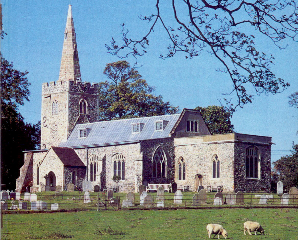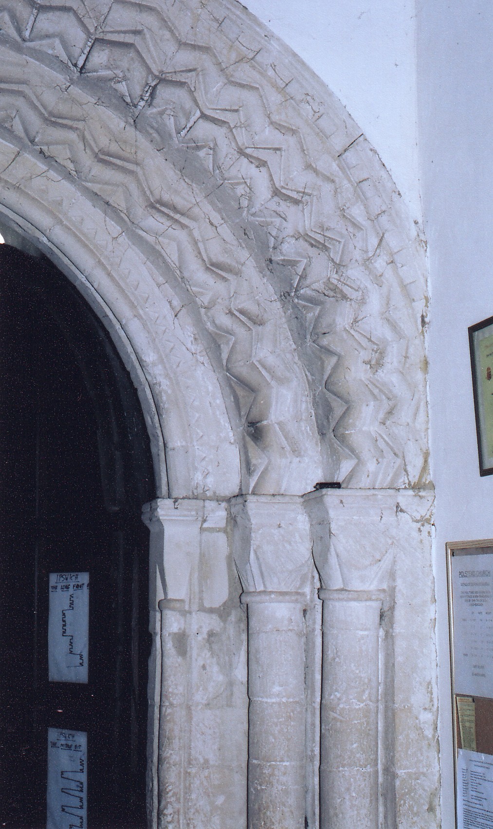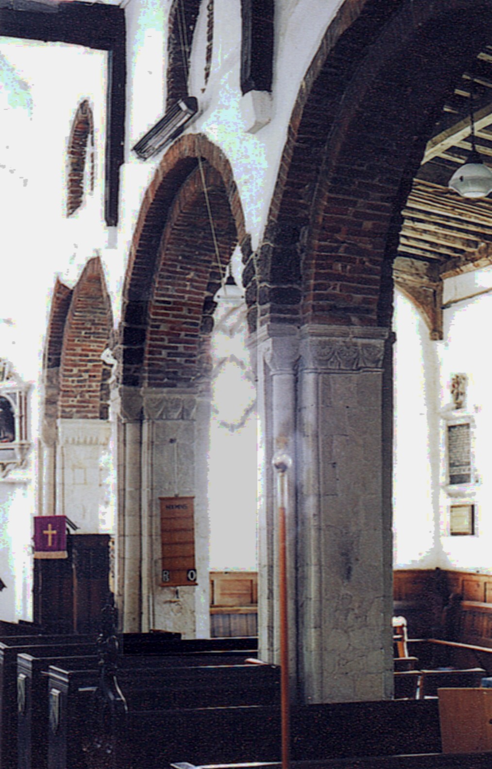 This church stands in an attractive spot above the valley of the little River Box, looking out across rolling fields hedged with trees. Constructed of flint and pebble rubble with limestone dressings, it consists in plan of a W. tower, an aisled nave with N. and S. porches, and a flat-roofed chancel, and externally it is pleasant but not special - except, perhaps, in having the only mediaeval stone spire in the county. What one sees on entering, therefore, is a revelation, for not only does the church have one of the most rewarding Norman interiors in Suffolk, but it probably also has the most surprising. The only indications of this outside are the two small, blocked, round-headed windows in the chancel walls, but one dismisses these at first as spurious and of probable Tudor date, as they are turned in bricks of quite the wrong shape and size to be re-used Roman material and it is generally acknowledged that bricks were not made in post-Roman England until the fifteenth century. That, however, is an error, for Holy Trinity church, Kingston-upon-Hull, was built of brick in the early fourteenth century, and there is a spectacular example of thirteenth century brick building just 6 miles (9½ km.) east of Polstead at Little Wenham Hall. Indeed, even earlier are the fragmentary remains of Coggeshall Abbey not far away in Essex, of which the gate chapel may be dated c. 1225 and the bits and pieces of the cloister to c. 1190. There the bricks were made by Cistercian monks, who even appear to have known that if the clay was mixed with coarse sand before firing, then that would reduce shrinkage. Today, in our age of instant communications, it seems almost incomprehensible how people in the past could develop so much understanding of an subject in one place and yet for that knowledge to fail utterly to spread to the wider community for generations. Monks commonly lived very secluded lives, of course, but what of the builders of Little Wenham Hall? What did they do before and afterwards? Similar questions can be asked about the builders here at Polstead, for inside this church one is confronted with an astonishing display of heavy Norman arches all turned in brick, very little of which is Roman. The arcades consist of three bays plus one, there are the expected chancel and tower arches (although the latter was actually the external W. doorway before the tower was added), and above all the arches except the chancel arch, there are blocked, brick Norman windows, of which those to north and south once formed a clerestory before the enlargement of the aisles in the fourteenth century. Altogether then, a large volume of bricks has been used here, and one must assume there were men on site or close by, making bricks for months during the church's main period of construction. Where did their knowledge come from, and did they never make use of it afterwards in this stoneless region where durable building materials were always at a premium? Perhaps they were immigrants, for there was established brick-making at this time in the Low Countries. Yet Alec Clifton-Taylor (The Pattern of English Building, London, Faber & Faber, 1972, pp. 211-212) was sceptical about that too, and pointed out that the Polstead bricks are larger than contemporary bricks in Flanders. It seems possible, therefore, that this little church in this rural corner of Suffolk, now actually displays the earliest example of native brickwork in England. The date, perhaps, is c. 1180.