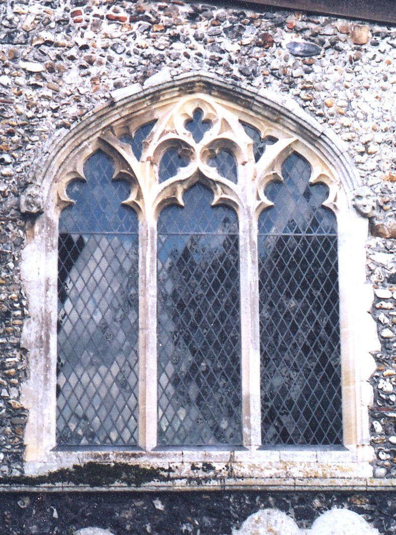 The post-Norman work at Polstead begins with the rebuilt S. arch at the W. end of the nave, discussed above, and continues with the unbuttressed tower of c. 1300, which has two lancet windows in the W. wall, of which the lower is cusped, and Y-traceried bell-openings, which are cusped to the north. The tower E. wall has the line of an earlier, steeper nave gable, showing clearly against it. The enlargement of the aisles seems to have taken place just after the tower was built, for the N. porch has two-light windows also with cusped Y-tracery, and an outer doorway formed of two flat-chamfered orders, and the S. porch still has lancet windows and a flat-chamfered doorway. The S. aisle has Decorated tracery to the east and west (reticulated in the first case, and formed of two groups of three mouchettes in the second) and the N. aisle has Decorated tracery to the E. window (shown above right) and to the N. window west of the porch. The two-light chancel windows to north and south have reticulated tracery and although this has been renewed outside, inside it looks old. That leaves two aisle windows on each side of the church and the chancel E. window, which have supermullioned tracery. These were probably inserted about a century later but the design of the aisle windows is unusual and not even consistent, for one pair is segmental-arched and the other, round-arched.