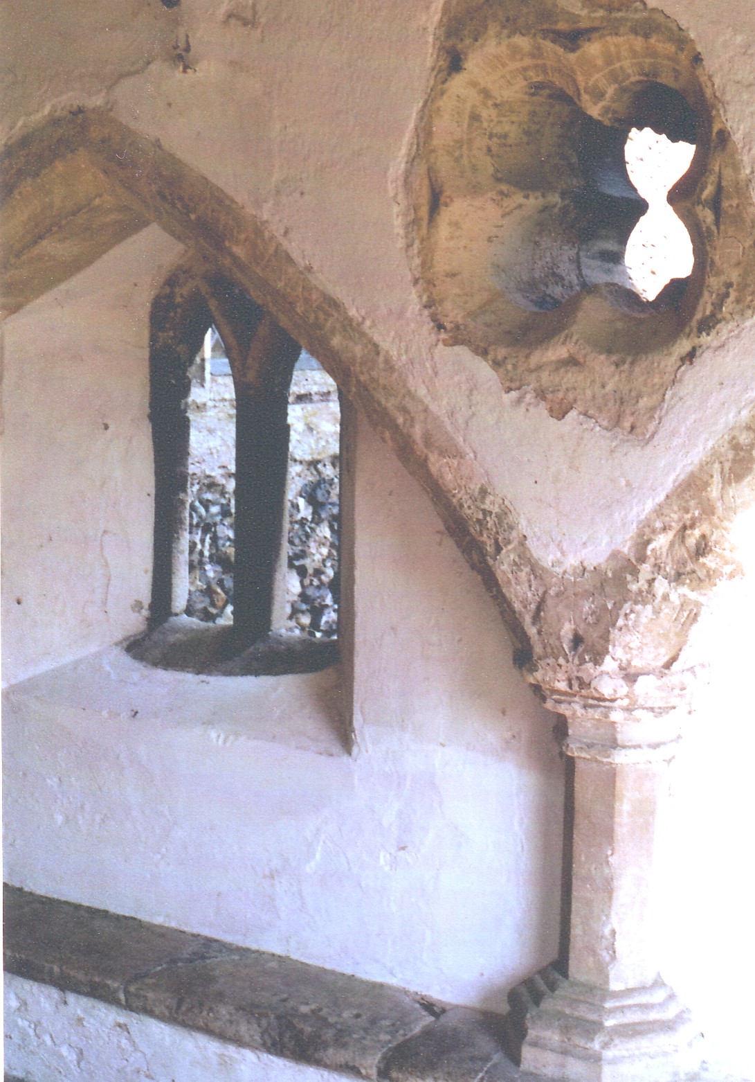 The rest of the building, comprising a chancel and a nave with a wide independently-gabled S. aisle and a two-storeyed S. porch, presents conflicting evidence variously suggesting a late thirteenth century or early fourteenth century date, and unfortunately, a compromise c.1300 does not really address these difficulties for some features of the church can scarcely predate 1315 at the earliest, while others would have been conservative at least fifteen years before. In such a case, it is sometimes possible to imagine two master masons at work, one early and one late in his career, co-operating at one level while yet each contributing his favoured designs, yet the two styles are so jumbled here, that this hypothesis is not convincing either and instead, Birkin Haward's theory (Suffolk Mediaeval Church Arcades, Hitcham, Suffolk Institute of Archaeology and History, 1993, pp. 328-329) that the aisle was first added in the late thirteenth century but that the arcade was reconstructed within the earlier walls, just a few decades afterwards, seems most likely to be correct.