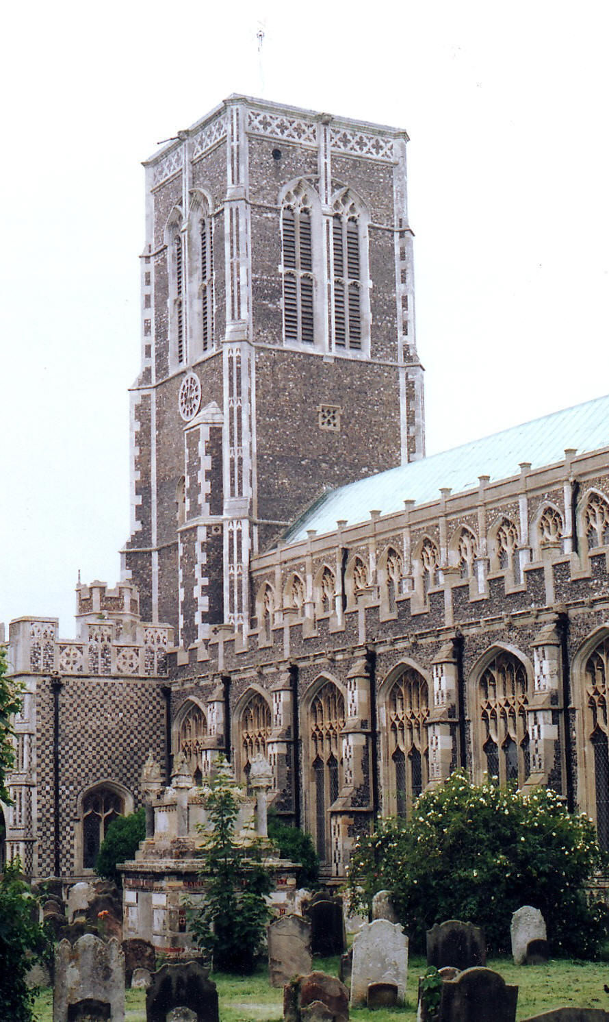 A major Perpendicular church with an impressive display of flint flushwork.