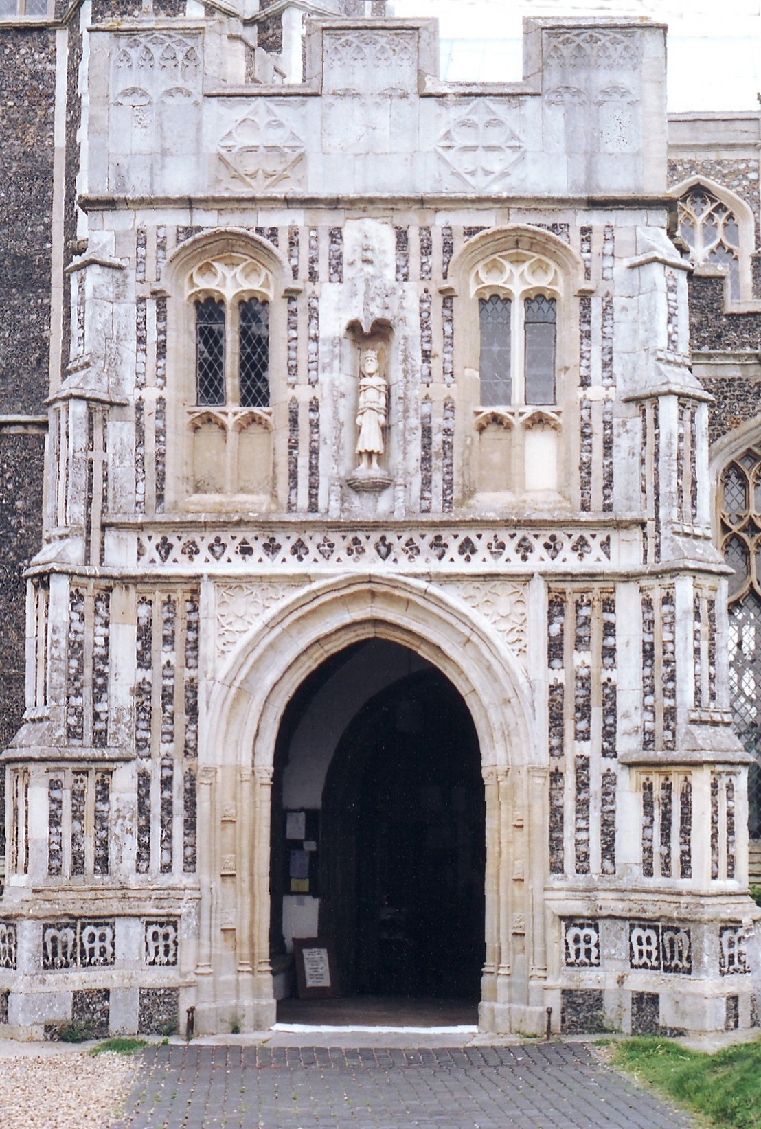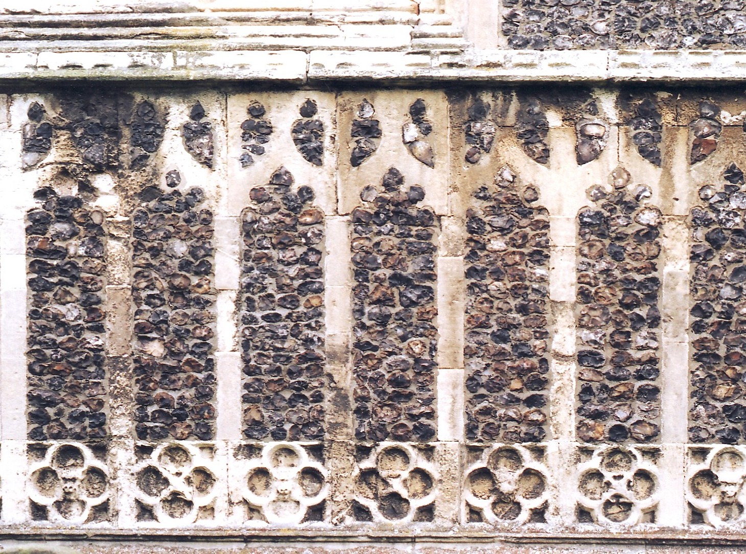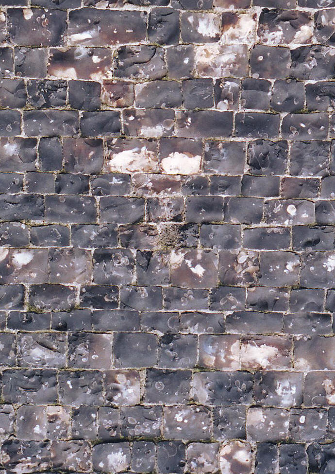 The church consists of a six-bay nave and a three-and-a-half-bay chancel, with aisles that continue for a bay and a half beside the chancel to create chapels, and an outstanding diagonally-buttressed tower that rises in four stages, while the S. porch (shown below left) is two-storeyed with a stair turret in the re-entrant with the aisle to the northwest. The exterior of the church is especially impressive, due predominantly to three things: the uniformity of style, the admirable design of the windows, and the skilful use made of the building materials, which are local flint with dressings of white stone that may have come from Caen in Normandy. Both Caen and Southwold are on or near the coast of course, and so both had the advantage of good transport links at a time when the carriage of bulk materials inland was often prohibitively expensive. The principal areas of flushwork are the tower and S. porch, together with all the buttresses and the basal frieze around the entire building. (The photograph at the foot of the page shows the basal frieze beneath the chancel E. window.) The tower W. front has a large area of diapering beneath the second stage string course, an inscription above the W. window with each letter crowned ('SCT. EDMUND ORA P. NOBIS' - 'Saint Edmund pray for us'), blank panelling each side of the window, and more lower down, either side of the W. doorway. The S. porch displays: (i) at the sides, flushwork two-light supermullioned arches on the battlements, and walls below entirely covered in diapering; and (ii), to the south, blank arcading in two tiers beside the outer doorway, more of the same on each side of the two, two-light windows in the upper storey, and the repeated monogram 'MR' around the base. This suggests that a statue of St. Mary once occupied the canopied niche between the upper storey windows where there is now a modern statue of St. Edmund. Flushwork is also prominent on the parapet and outer faces of the tower buttresses. The rest of the church is faced with knapped flints everywhere, fitted closely together with the narrowest of mortar joints. In some places, such as the sides of the tower buttresses, these flints have also been accurately squared (as illustrated below right), a task that must have constituted months of labour in a building on this scale.